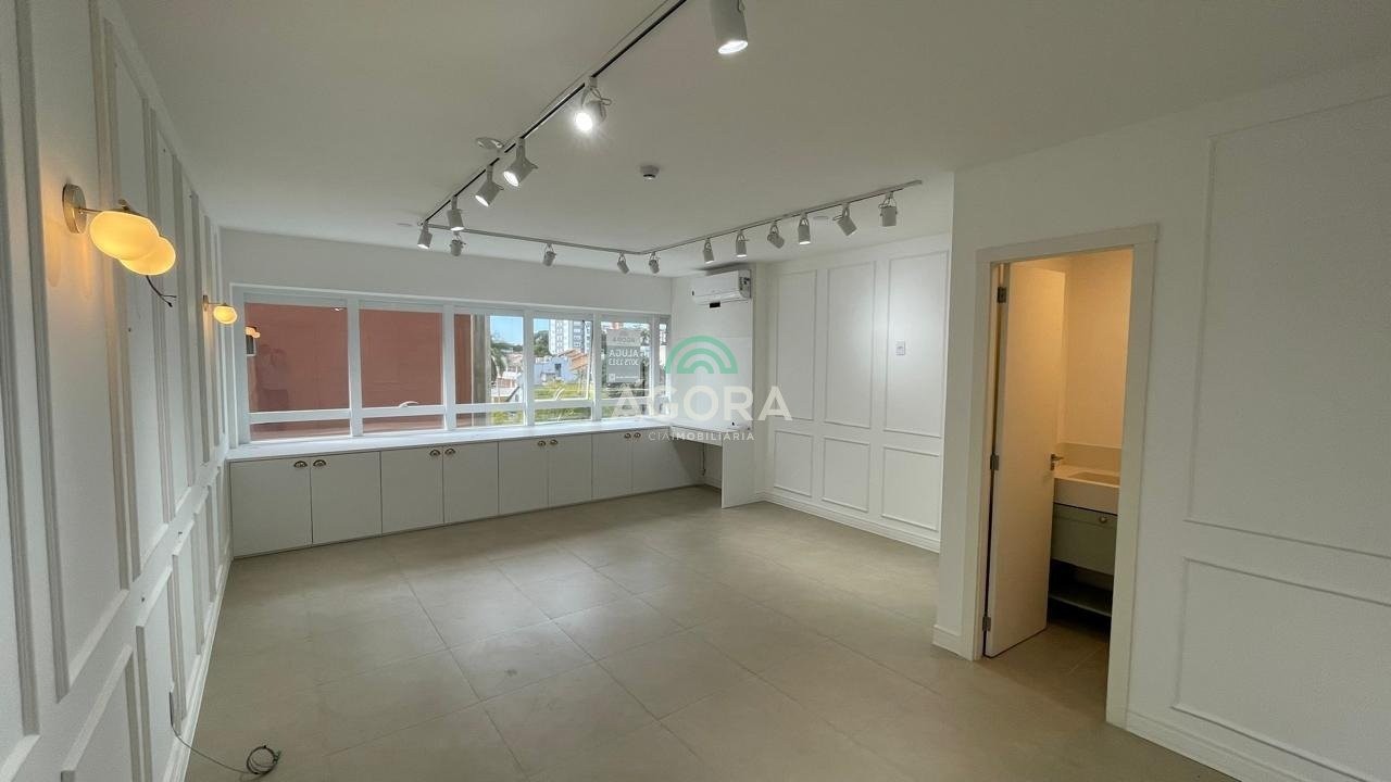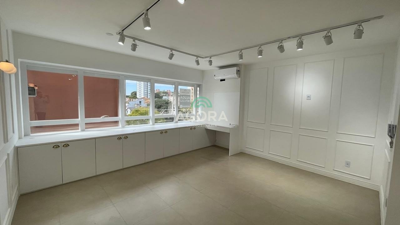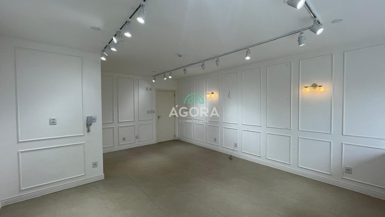 Sala comercial com 34,08m², 2 vagas de garagem, amplas janelas em pele de vidro, proporcionando excelente luminosidade e conforto térmico. Lavabo, piso em porcelanato, armário abaixo da janela, luminárias, molduras de embelezamento nas paredes. Prédio conta com portaria presencial durante horário comercial e remota fora do expediente, dois elevadores, cafeteria no térreo. Aluguel mais encargos