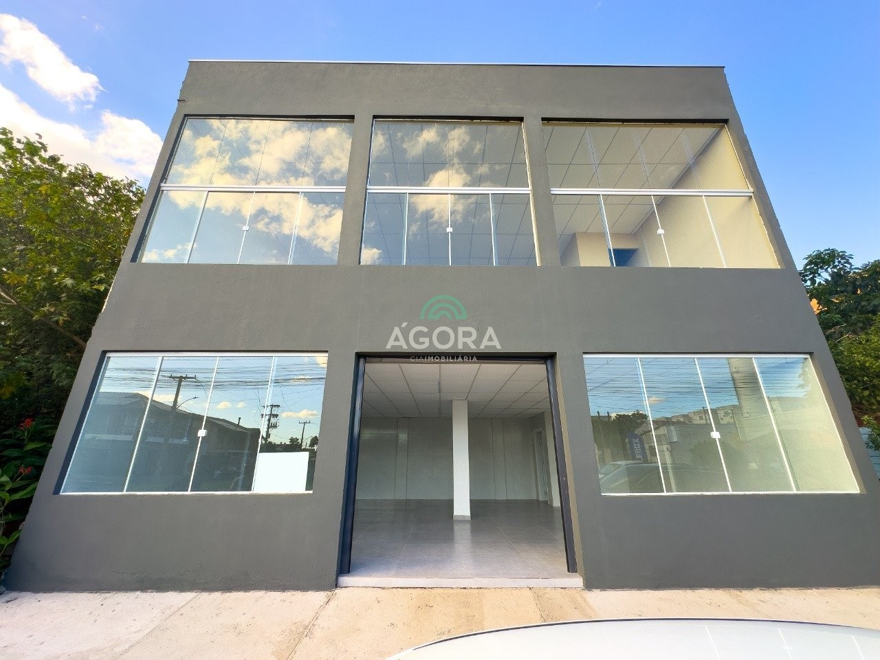 Loja com 75m², pé direito alto, fachada de vidro e opções de ampliação.