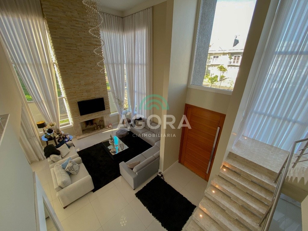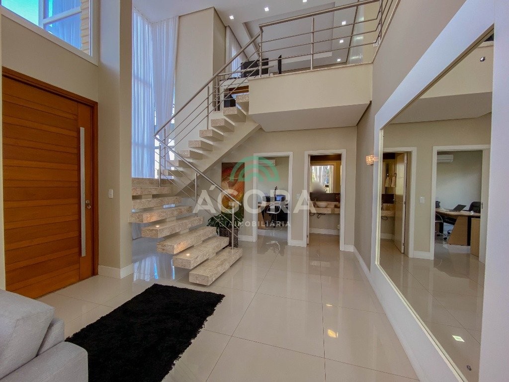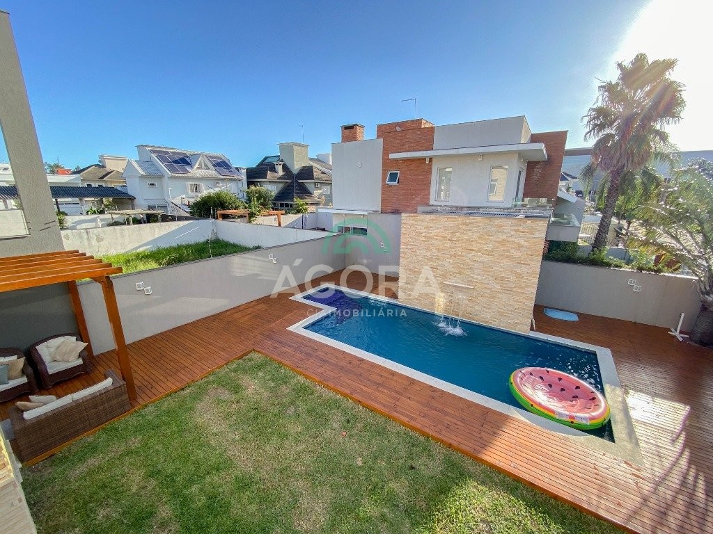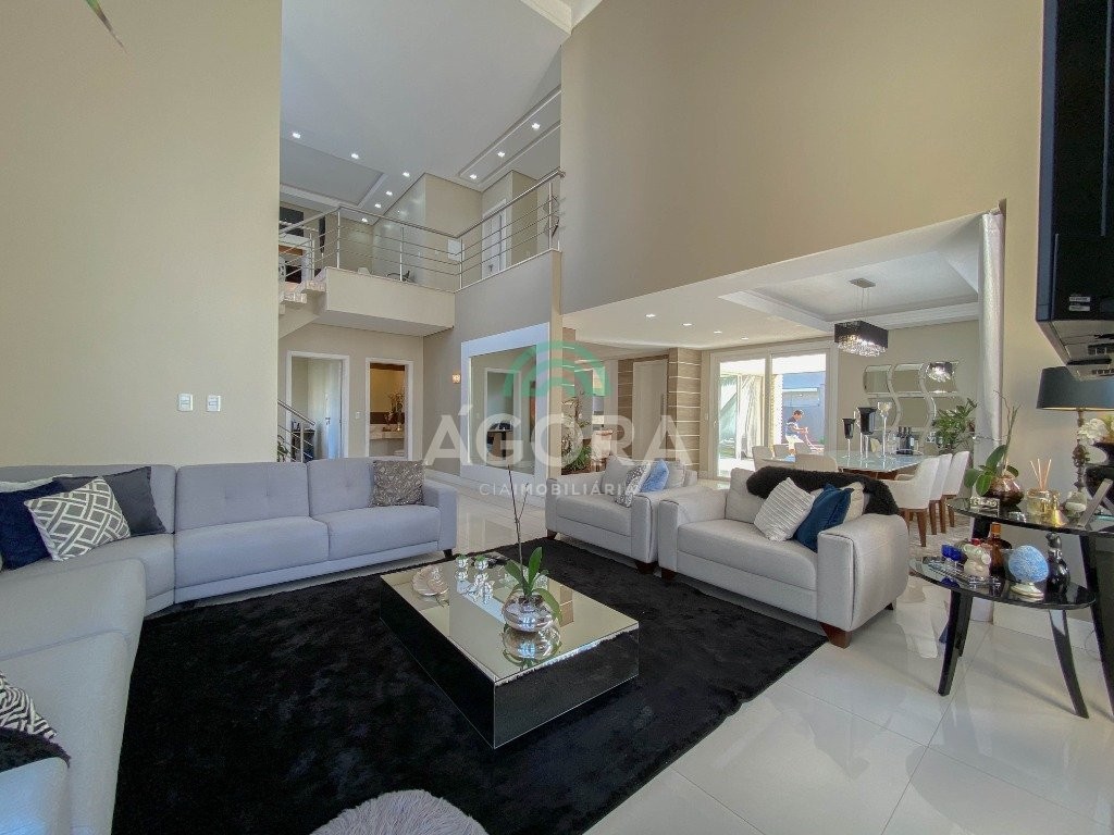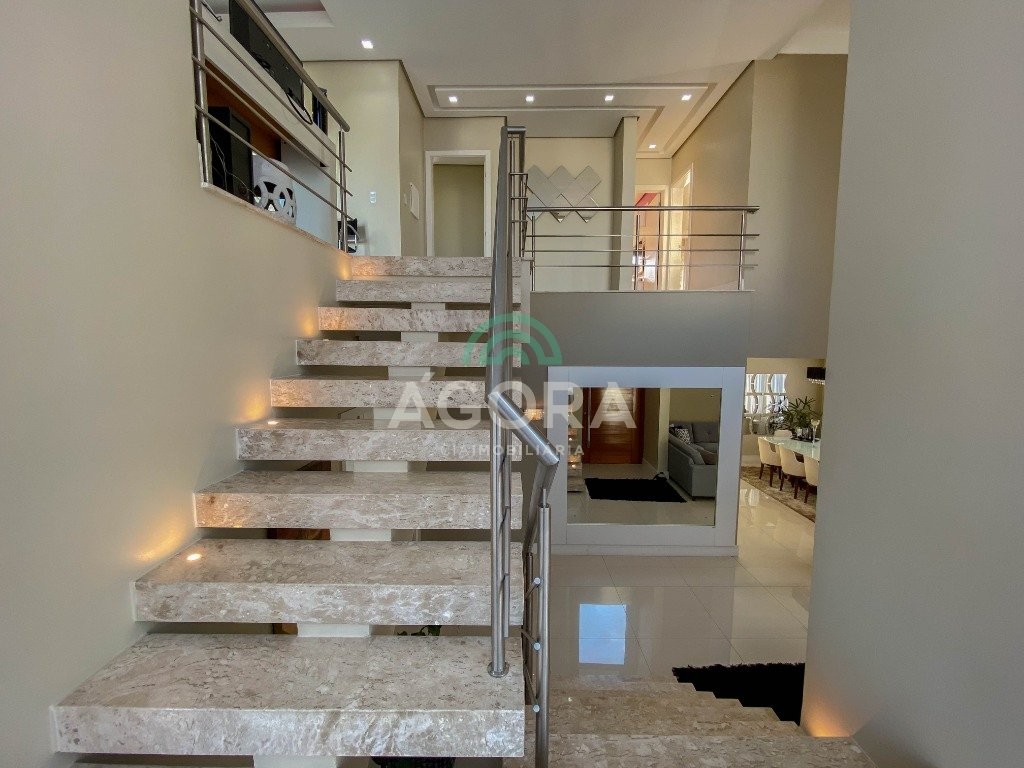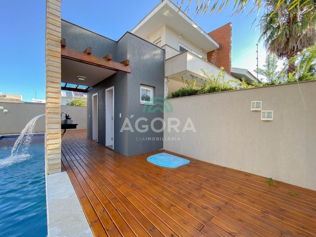 Sobrado com 300m² privativos, 4 quatro) dormitórios, sendo 3 (três) suítes com sacada, 2 (duas) suítes master com banheira de hidromassagem, escritório, mezanino com varanda, sala de estar com pé direito duplo e lareira, cozinha, lavabo, sala de jantar, espaço gourmet com mesa de bilhar que dá acesso a um lindo pátio com deck e piscina medindo 4mx10m, anexo a piscina há mais 1 (um) banheiro e 1 (um) depósito, vagas para 4 (quatro) carros.