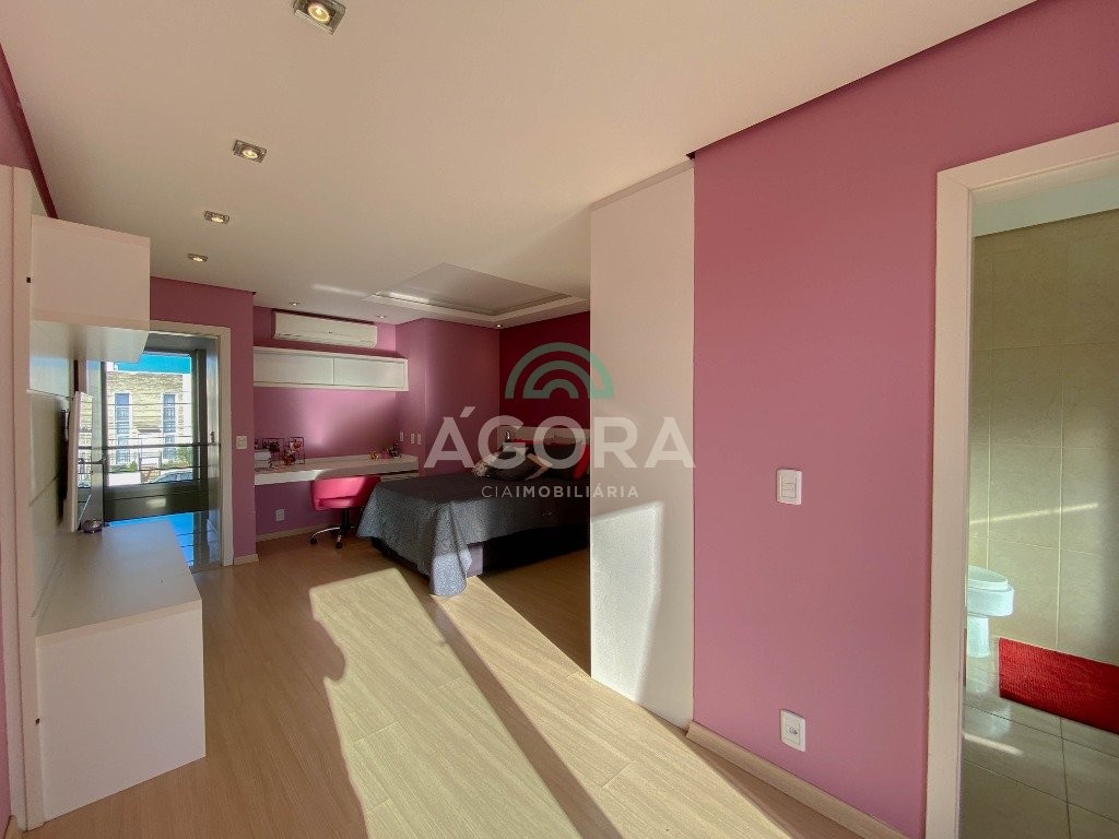 Sobrado com 300m² privativos, 4 quatro) dormitórios, sendo 3 (três) suítes com sacada, 2 (duas) suítes master com banheira de hidromassagem, escritório, mezanino com varanda, sala de estar com pé direito duplo e lareira, cozinha, lavabo, sala de jantar, espaço gourmet com mesa de bilhar que dá acesso a um lindo pátio com deck e piscina medindo 4mx10m, anexo a piscina há mais 1 (um) banheiro e 1 (um) depósito, vagas para 4 (quatro) carros.