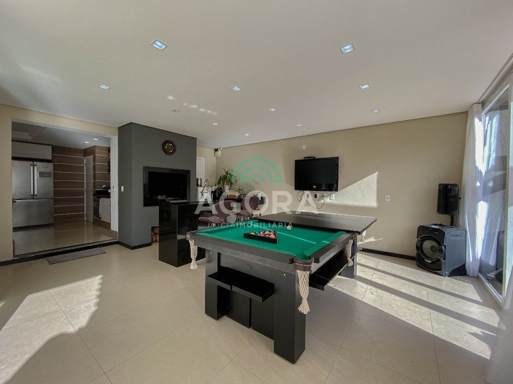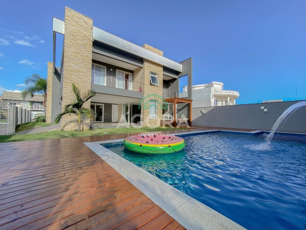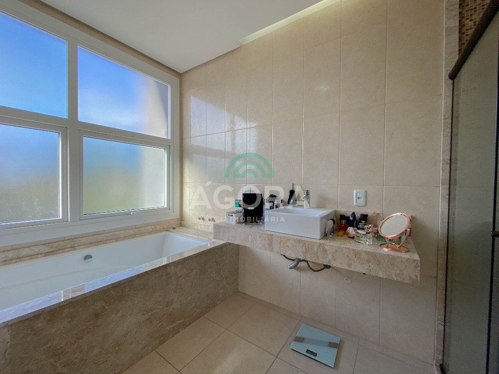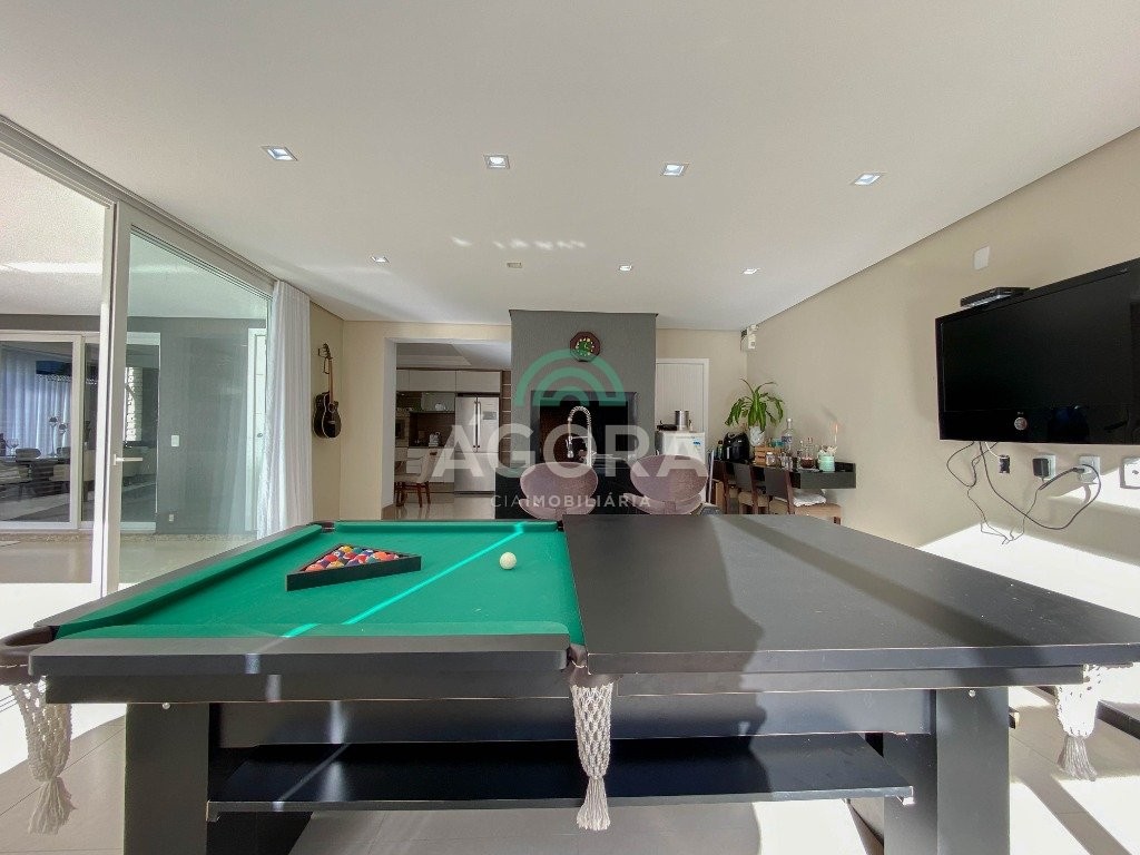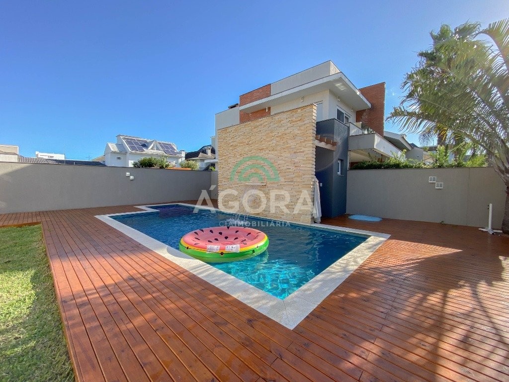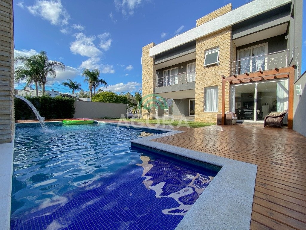 Sobrado com 300m² privativos, 4 quatro) dormitórios, sendo 3 (três) suítes com sacada, 2 (duas) suítes master com banheira de hidromassagem, escritório, mezanino com varanda, sala de estar com pé direito duplo e lareira, cozinha, lavabo, sala de jantar, espaço gourmet com mesa de bilhar que dá acesso a um lindo pátio com deck e piscina medindo 4mx10m, anexo a piscina há mais 1 (um) banheiro e 1 (um) depósito, vagas para 4 (quatro) carros.