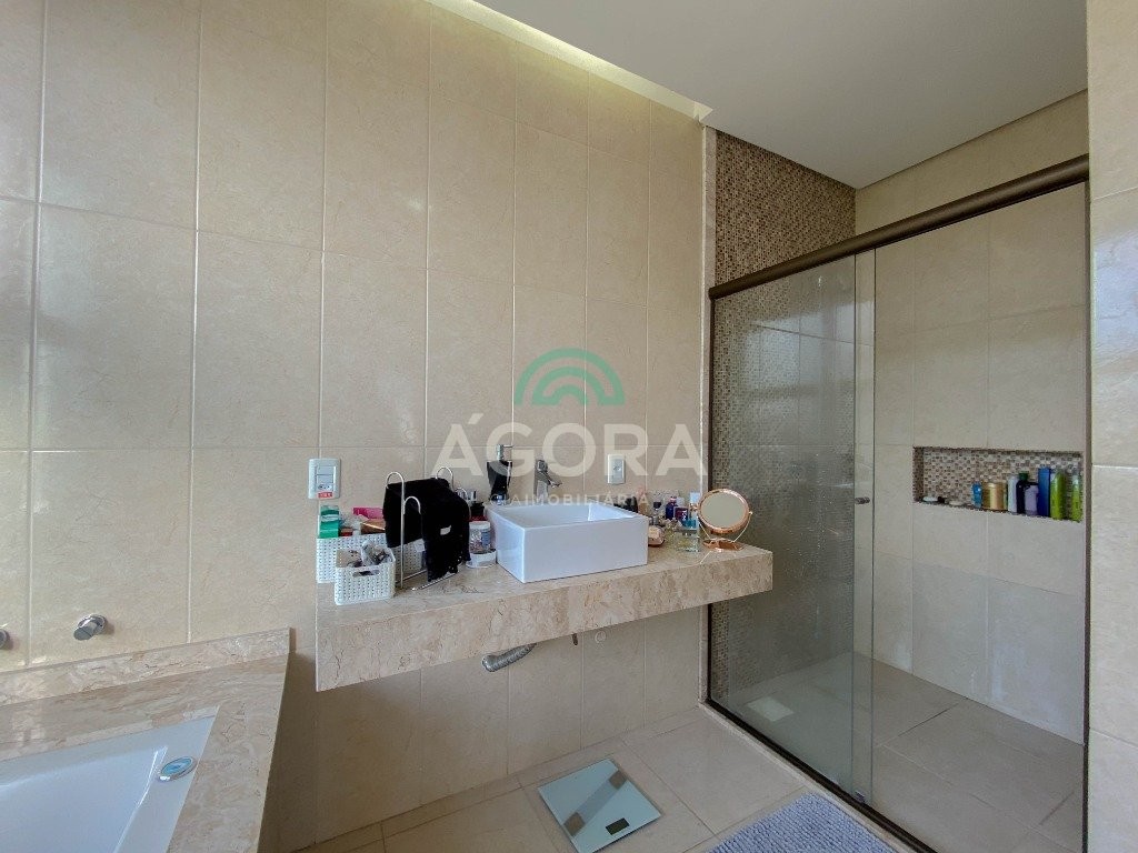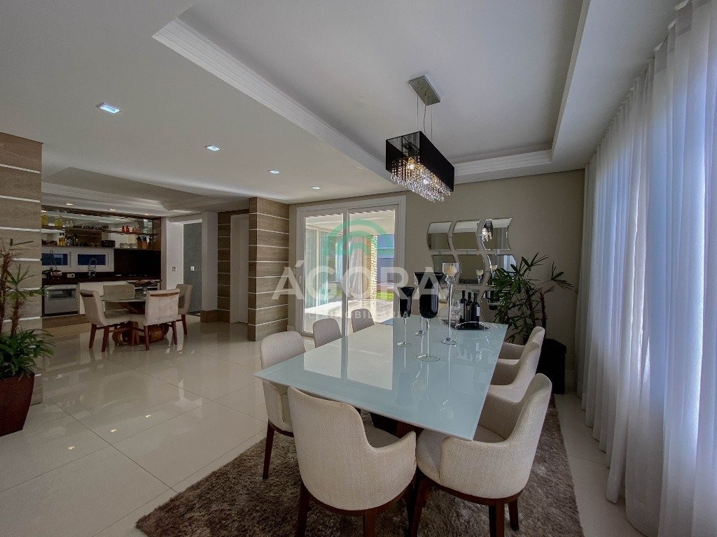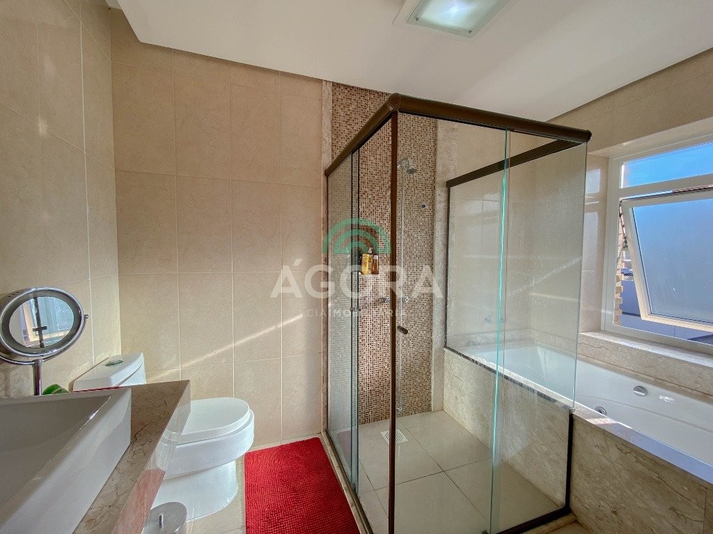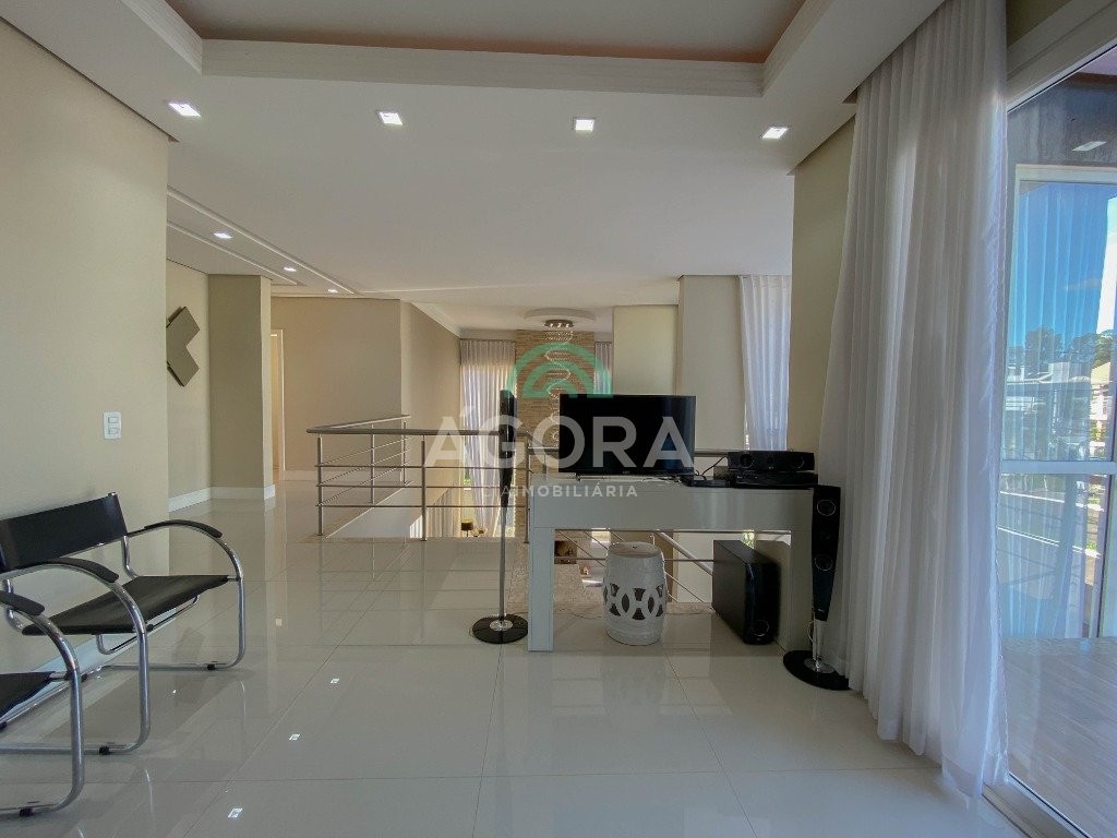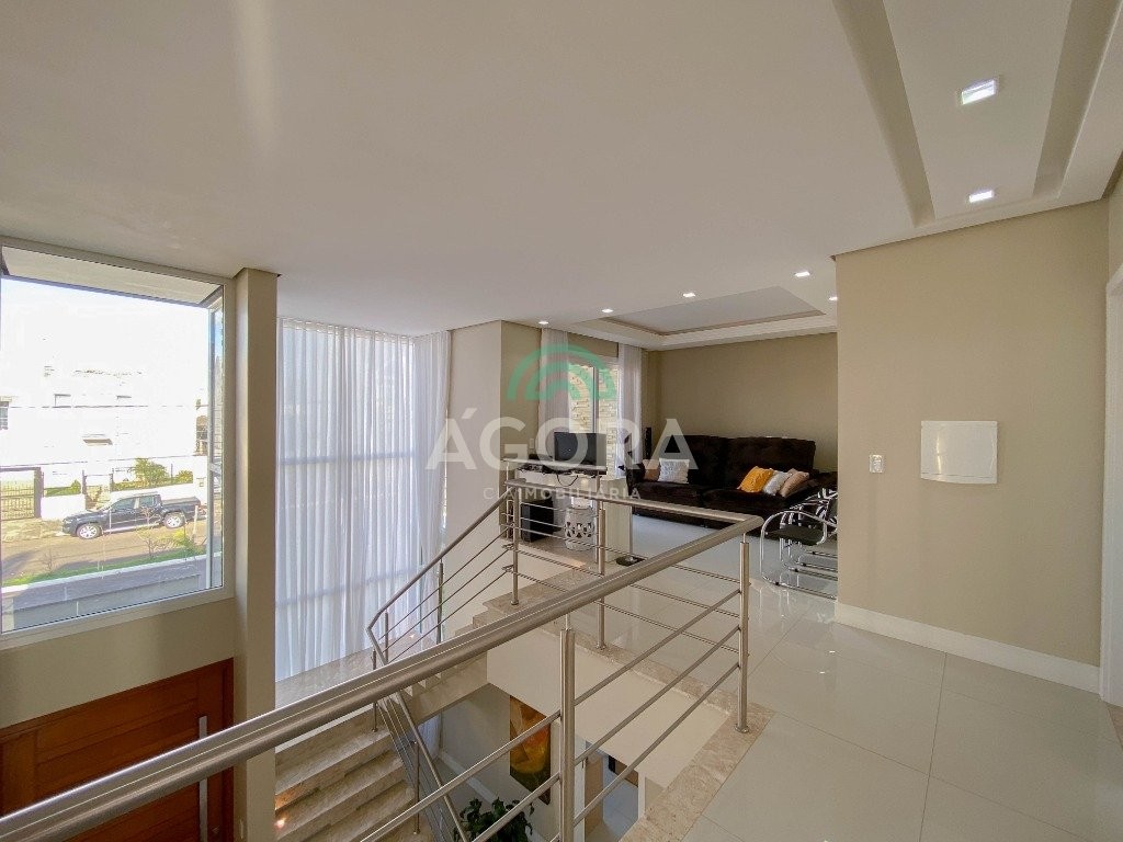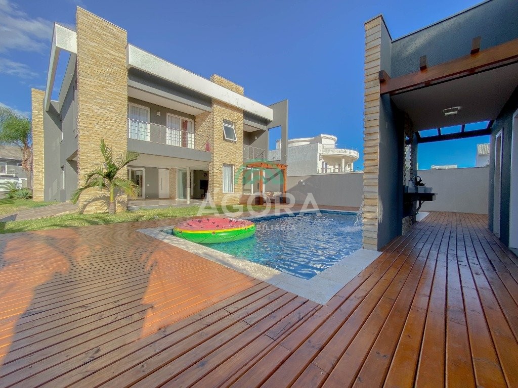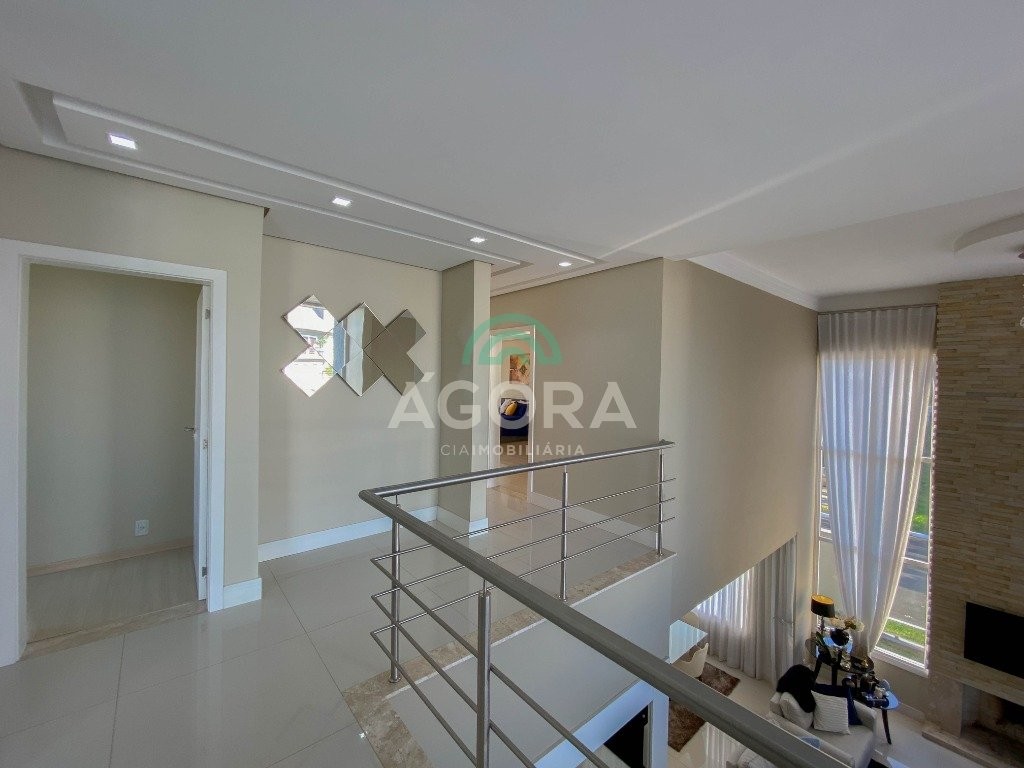 Sobrado com 300m² privativos, 4 quatro) dormitórios, sendo 3 (três) suítes com sacada, 2 (duas) suítes master com banheira de hidromassagem, escritório, mezanino com varanda, sala de estar com pé direito duplo e lareira, cozinha, lavabo, sala de jantar, espaço gourmet com mesa de bilhar que dá acesso a um lindo pátio com deck e piscina medindo 4mx10m, anexo a piscina há mais 1 (um) banheiro e 1 (um) depósito, vagas para 4 (quatro) carros.