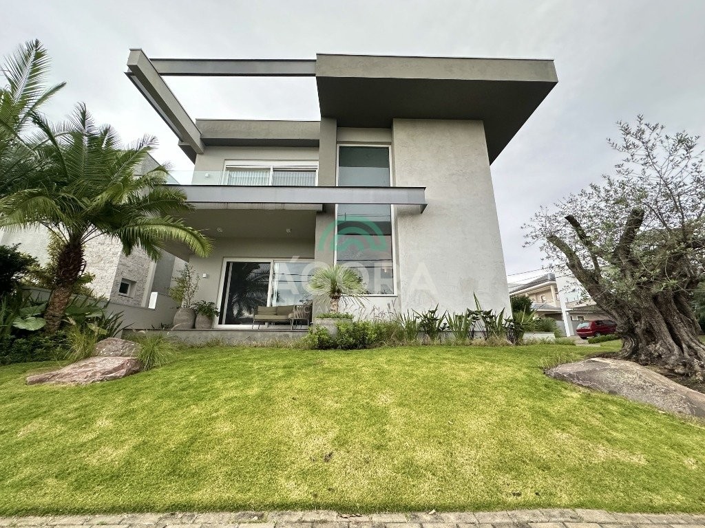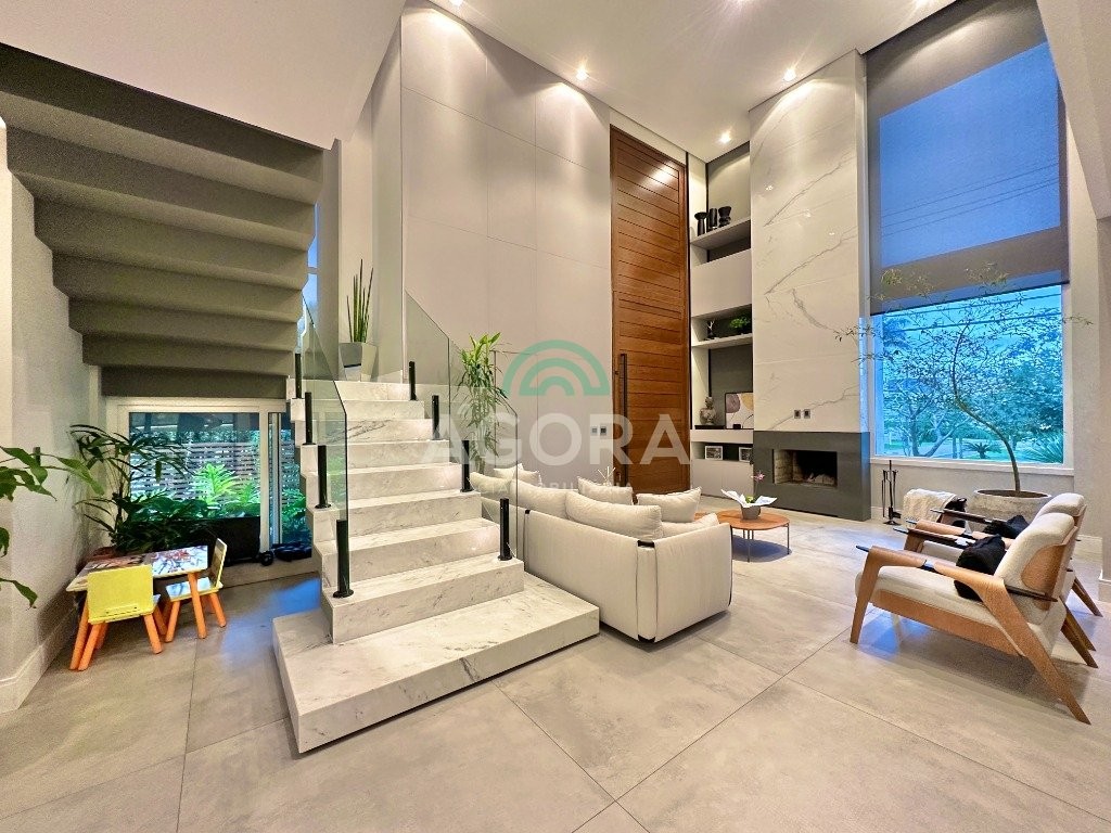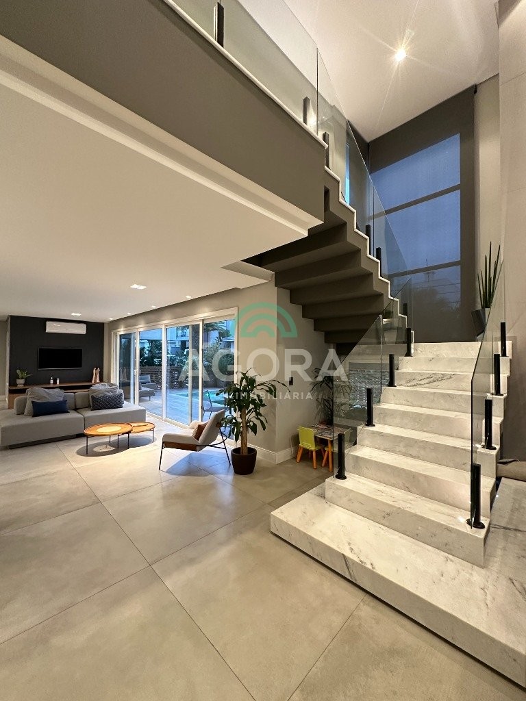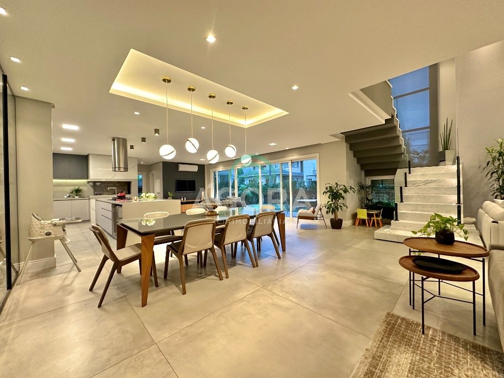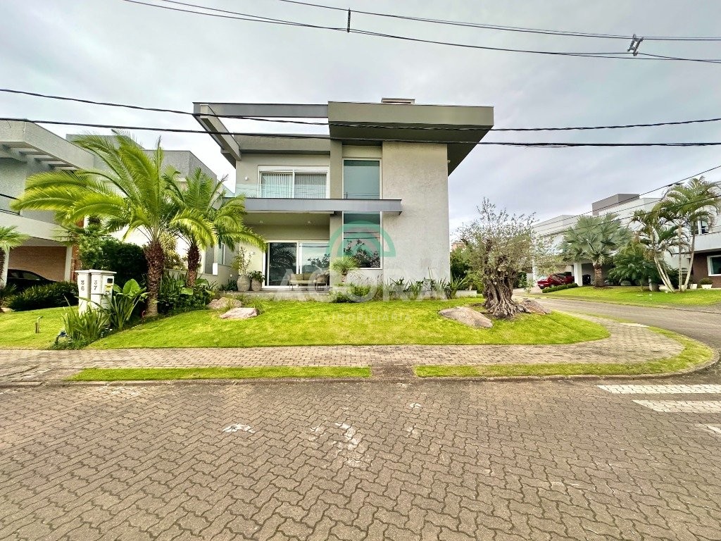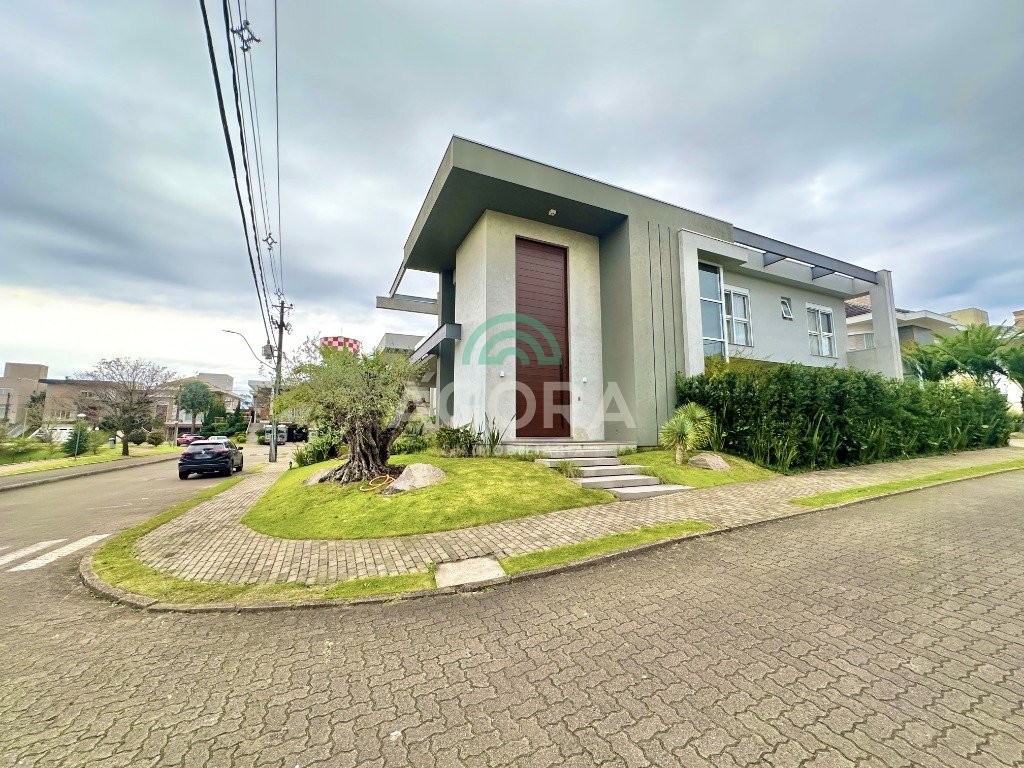 Ágora imobiliária vende: casa em condomínio fechado com 337m² em terreno de esquina. Dispõe de 4 (quatro) dormitórios, sendo 3 (três) suítes, sendo uma delas com banheira e chuveiro e cuba duplos. Living com 4 ambientes totalmente integrados, sendo cozinha com ilha. Imóvel com pé direito alto. Possui piscina com espera para aquecimento em integrada com living de convivência. O imóvel dispõe de vaga para 4 carros. Jardim com iluminação e irrigação totalmente automatizada. Excelente posição solar, sendo frente norte. Além disso, possui energia fotovoltáica e sistema de cisterna.