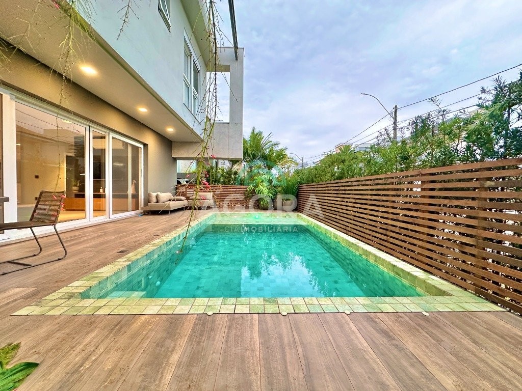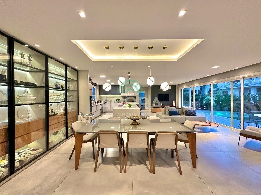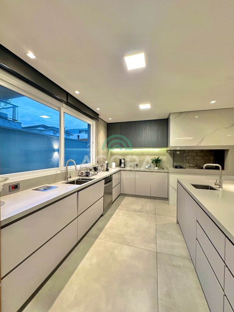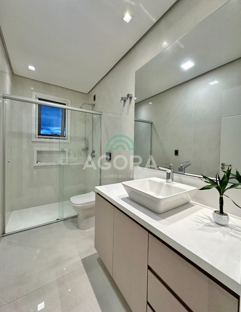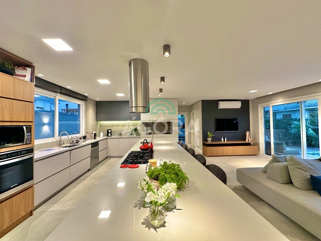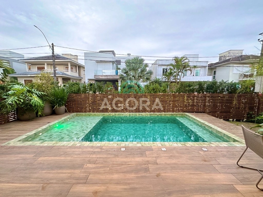 Ágora imobiliária vende: casa em condomínio fechado com 337m² em terreno de esquina. Dispõe de 4 (quatro) dormitórios, sendo 3 (três) suítes, sendo uma delas com banheira e chuveiro e cuba duplos. Living com 4 ambientes totalmente integrados, sendo cozinha com ilha. Imóvel com pé direito alto. Possui piscina com espera para aquecimento em integrada com living de convivência. O imóvel dispõe de vaga para 4 carros. Jardim com iluminação e irrigação totalmente automatizada. Excelente posição solar, sendo frente norte. Além disso, possui energia fotovoltáica e sistema de cisterna.
