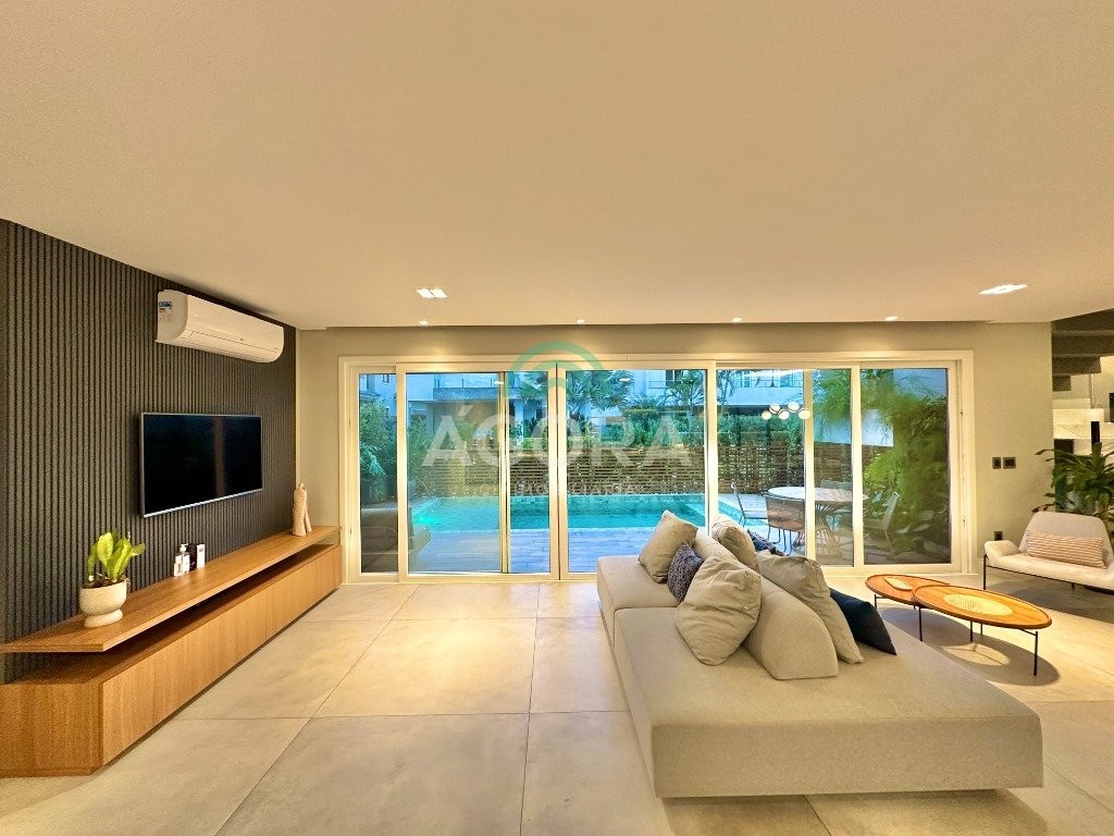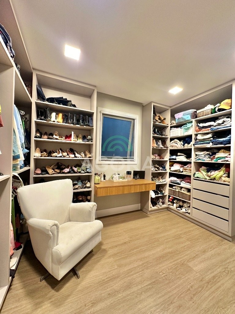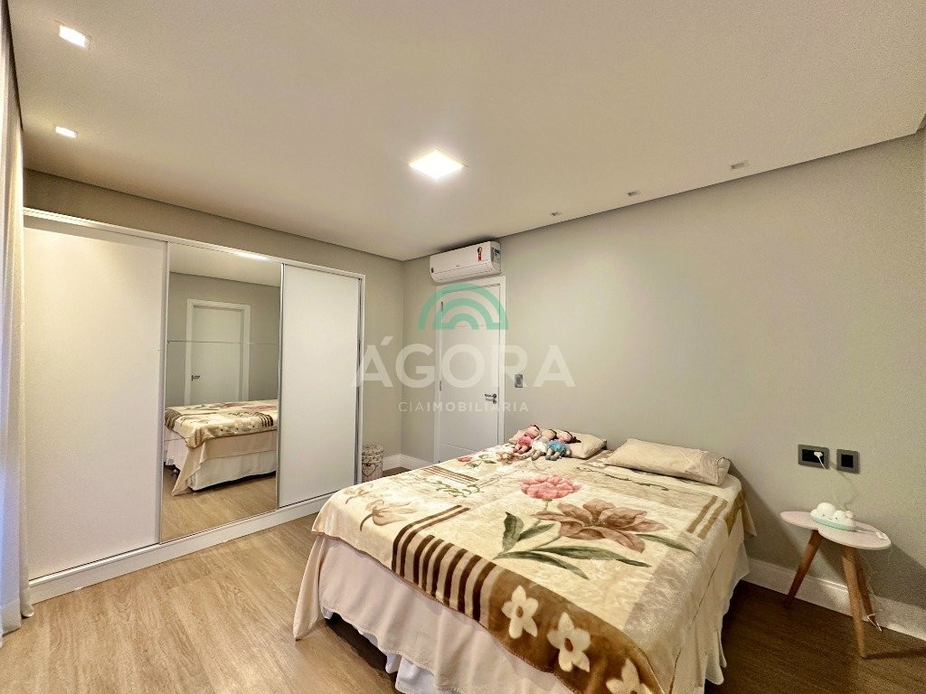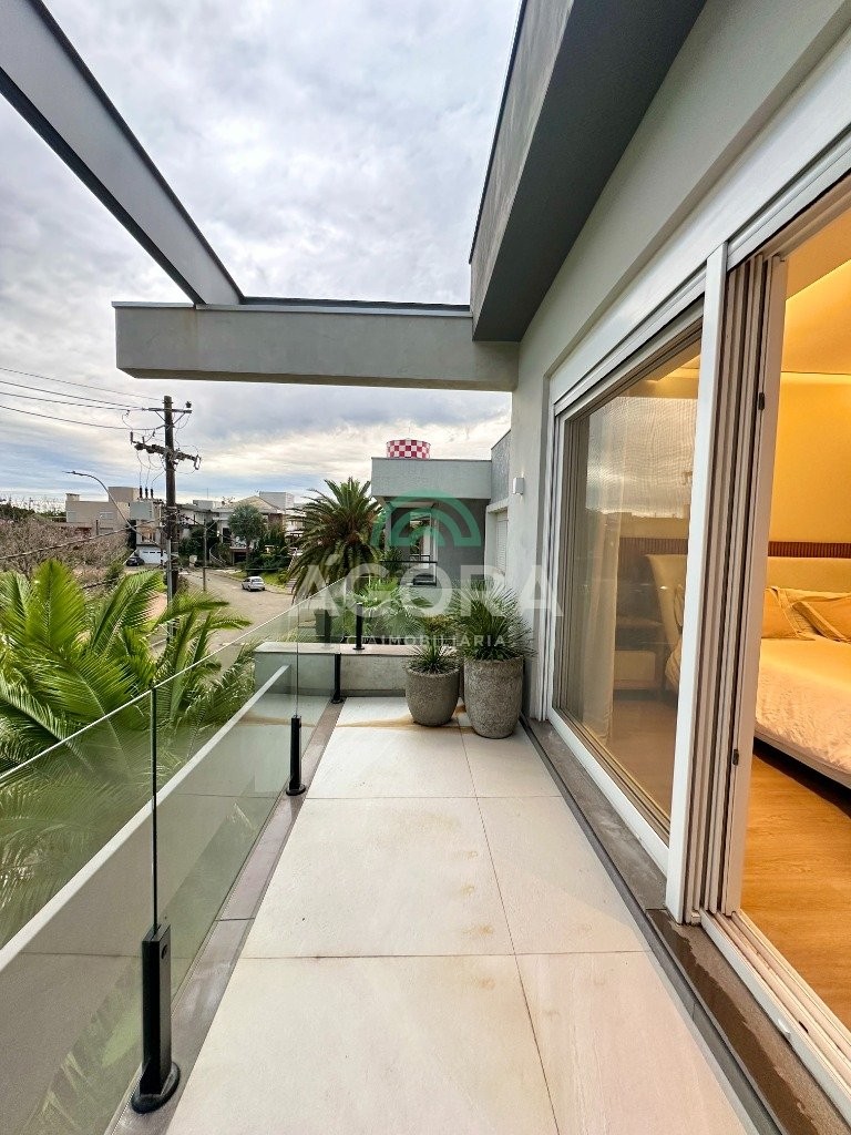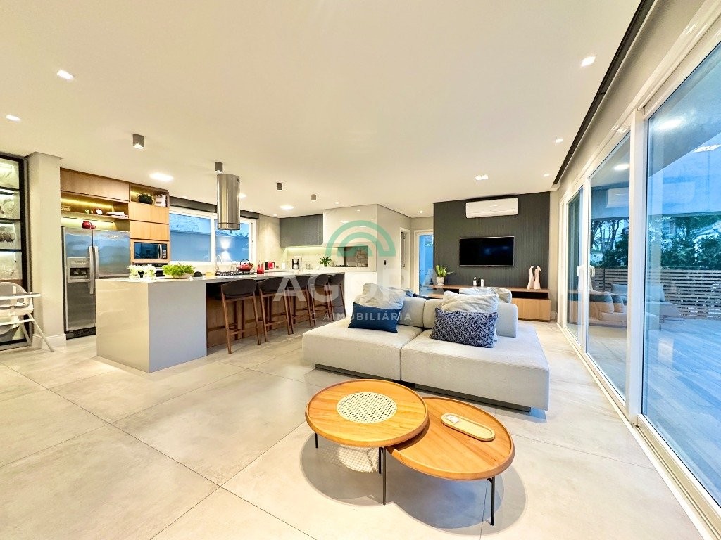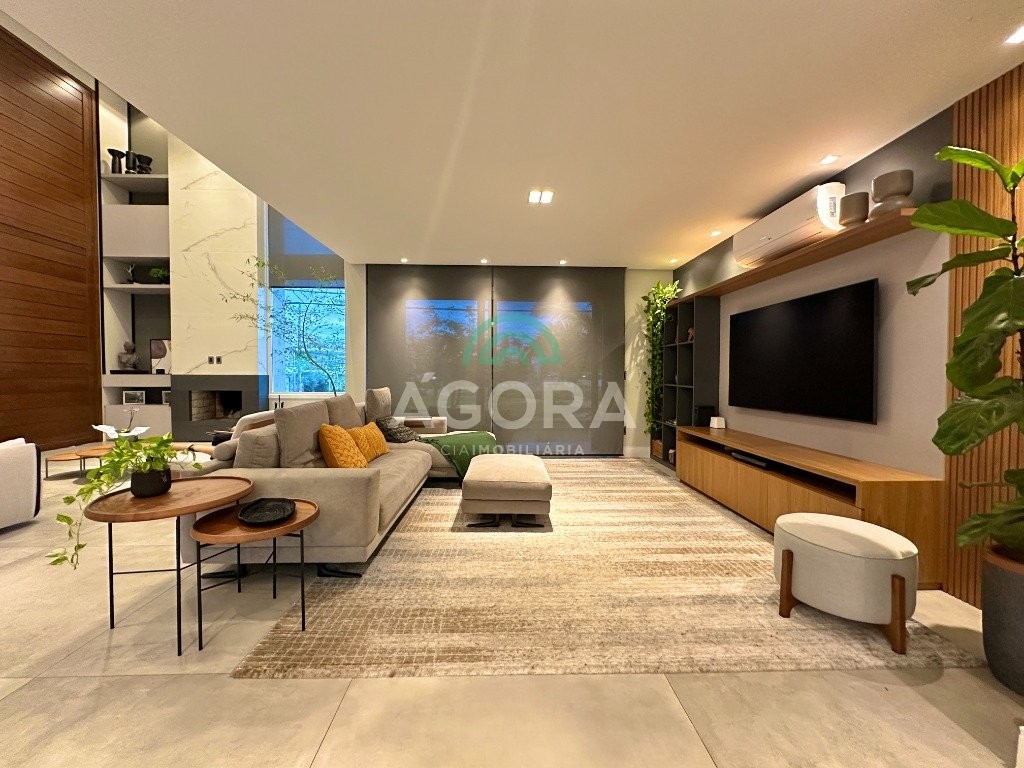 Ágora imobiliária vende: casa em condomínio fechado com 337m² em terreno de esquina. Dispõe de 4 (quatro) dormitórios, sendo 3 (três) suítes, sendo uma delas com banheira e chuveiro e cuba duplos. Living com 4 ambientes totalmente integrados, sendo cozinha com ilha. Imóvel com pé direito alto. Possui piscina com espera para aquecimento em integrada com living de convivência. O imóvel dispõe de vaga para 4 carros. Jardim com iluminação e irrigação totalmente automatizada. Excelente posição solar, sendo frente norte. Além disso, possui energia fotovoltáica e sistema de cisterna.