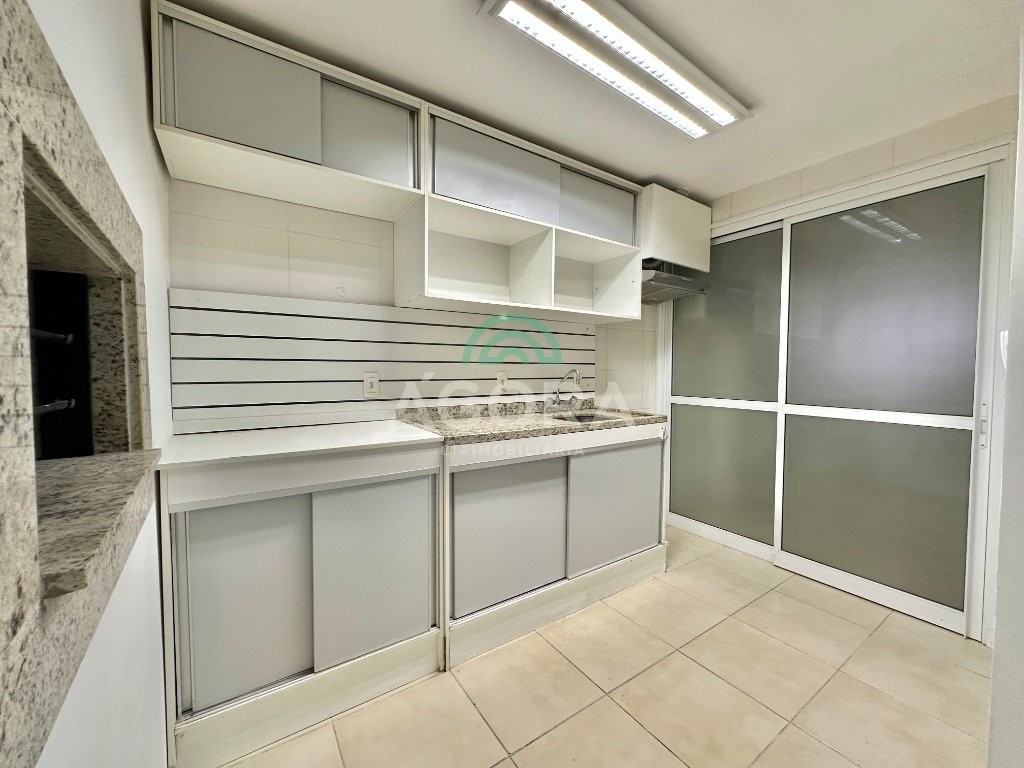 Apartamento de 93,38 m² com 3 dormitórios e sacada com churrasqueira.