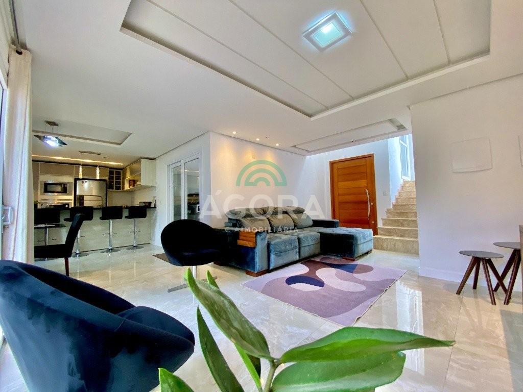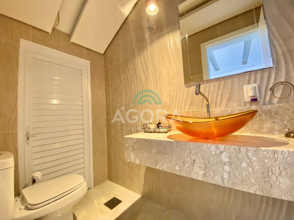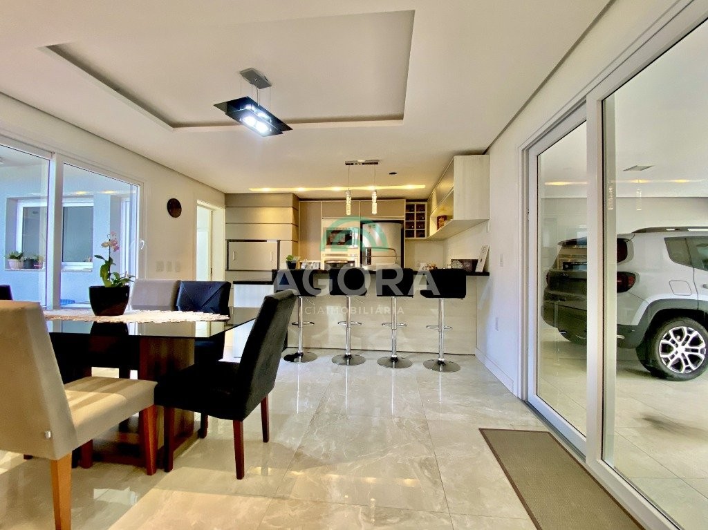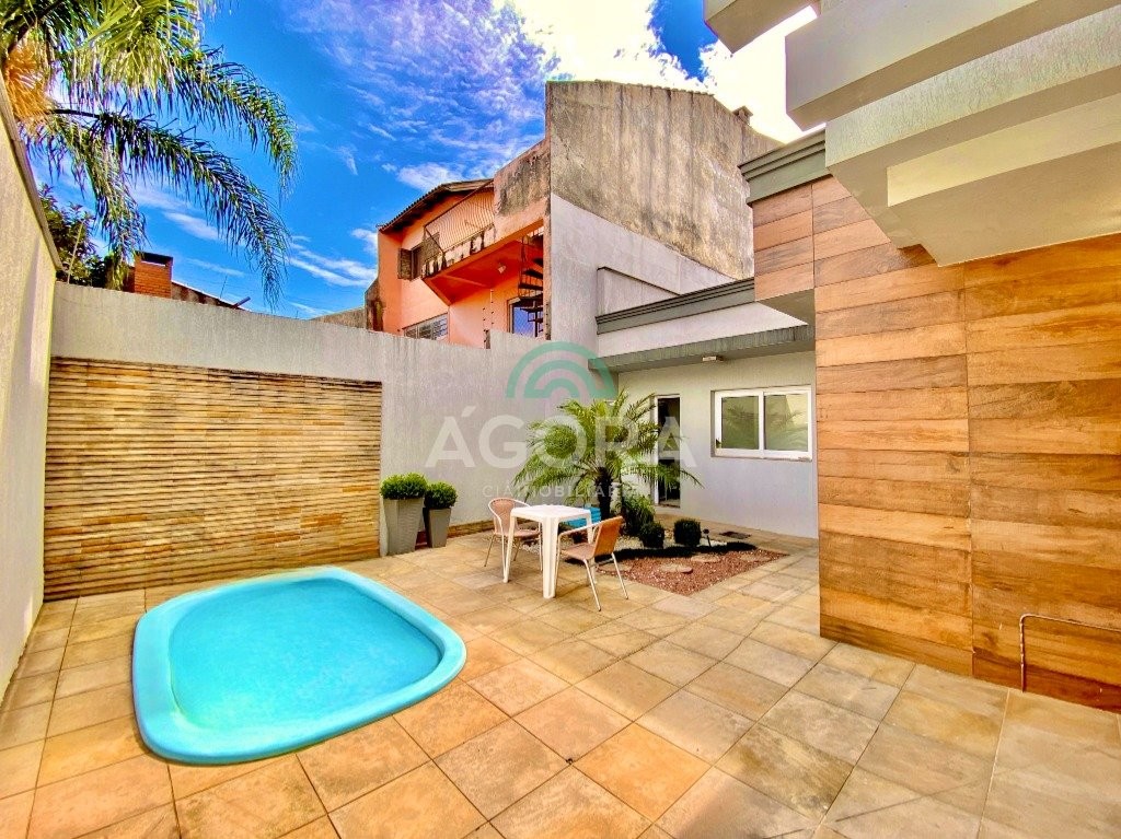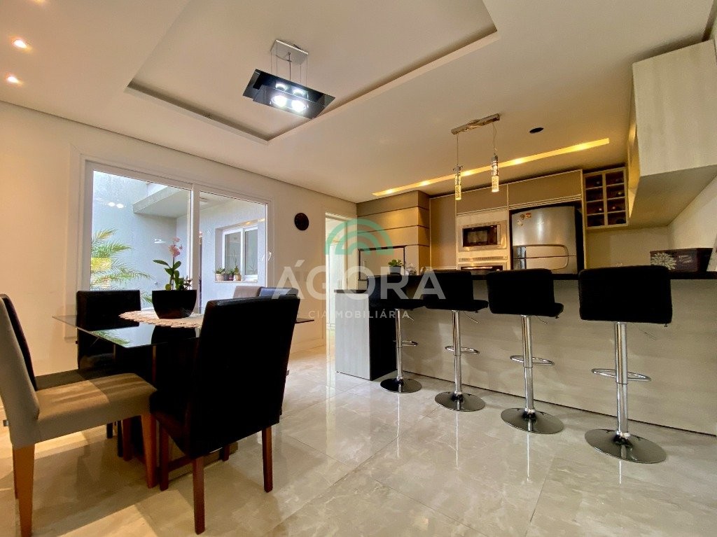 Lindíssimo sobrado de alto padrão semi-mobiliado, composto de 3 (três) dormitórios, sendo 1 (uma) suíte com sacada e closet, em piso vinílico, com escada em mármore travertino, sala de estar e jantar integradas, cozinha com churrasqueira e bancada estilo americana, banheiro social, lavabo, lavanderia independente, piso portinari em todo térreo e pátio nos fundos com piscina e banheiro auxiliar. Vaga de garagem coberta para 2 (dois) veículos e descoberta para mais 2 (dois) veículos.