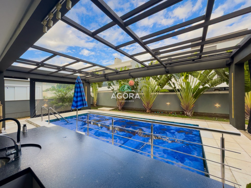 Ágora Cia Imobiliária vende: Sobrado mobiliado em condomínio de alto padrão de 296m², com 3 (três) dormitórios, sendo 2 (duas) suítes com closet, 1 (um) escritório, 2 (dois) depósitos, pé direito duplo, rebaixo em gesso, área gourmet, churrasqueira com parrilha, aberturas em PVC, persianas automatizadas, piscina aquecida e 4 (quatro) vagas. ótima localização.