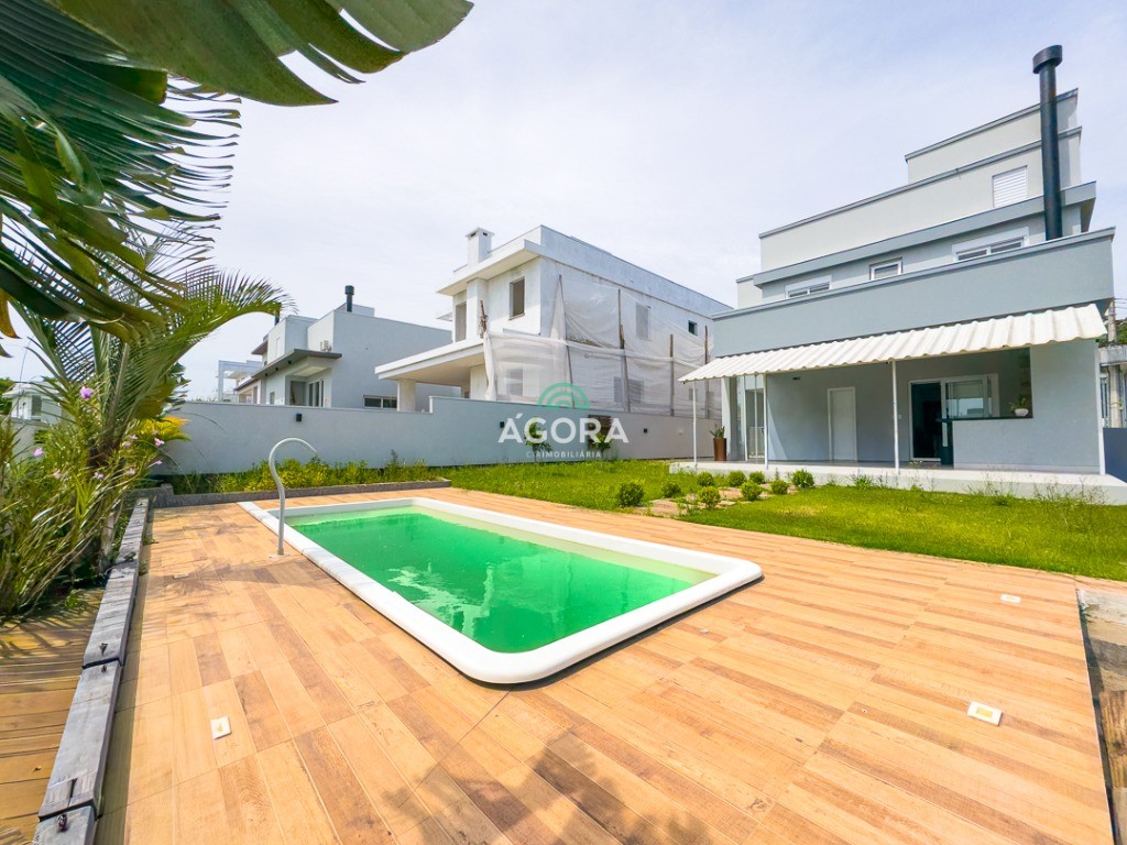 Ágora Cia Imobiliária vende: Sobrado em condomínio fechado no centro de Nova Santa Rita. Se você busca uma casa térrea ampla, projetada com requinte e alta qualidade construtiva, este sobrado é para você! O sobrado possuí área construída de 173m² e terreno medindo 382,50m². Garagem para 2 (dois) carros, sendo 1 (uma) coberta e 1 (uma) externa, 3 (três) dormitórios, sendo 1 (uma) suíte com closet e 2 (dois) dormitórios. Sala de estar e jantar em ambientes integrados, lavabo, cozinha interna, área gourmet, lavanderia e ampla área externa com piscina. Ambientes bem iluminados e arejados. Fica semimobiliado. Sistema de energia fotovoltaica (Conta de luz baixíssima) Carregador de carro elétrico na garagem. Água direto de poço do condomínio. Reservas do Lago Condomínio Clube se torna uma opção muito interessante, pois une os benefícios de um Condomínio Clube de Alto Padrão em meio a uma atmosfera com belas paisagens. Condomínio conta com academia, piscina, portaria 24 horas, quadra esportiva, espaço gourmet na área comum, clube, coworking, piscina com deck integrado, quadra de tênis, piscina aquecida, acesso por catracas com biometria Área para jogos, lago, quadra de beach tênis e futevôlei, lareira, quadra de areia, energia solar, área de lazer e segurança 24h. Agende sua visita  hoje mesmo!