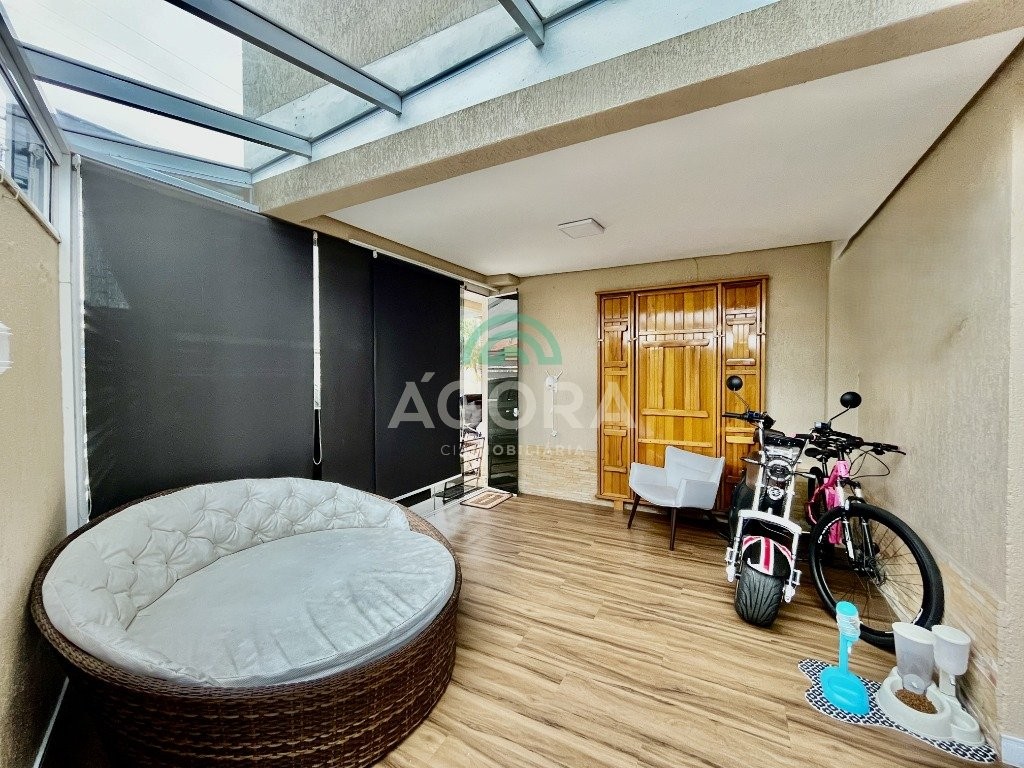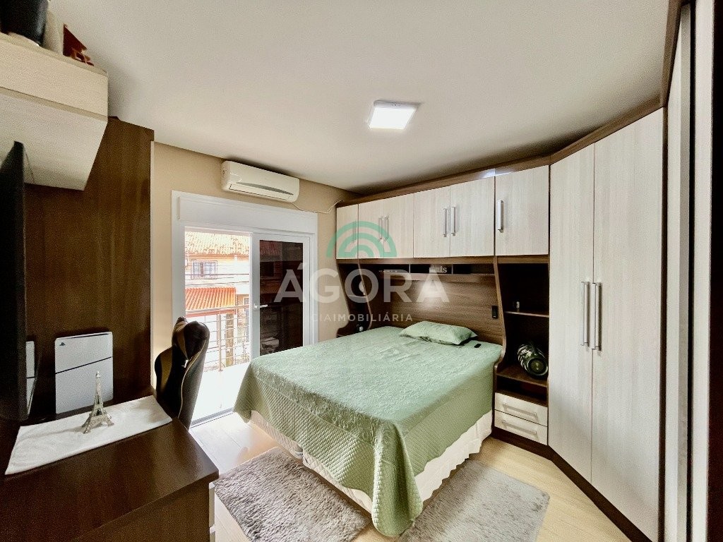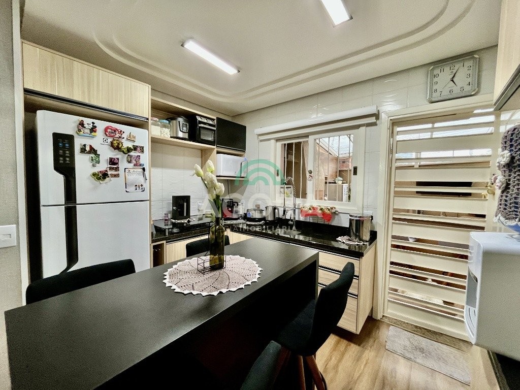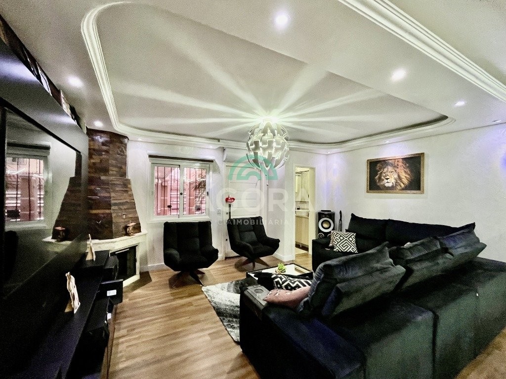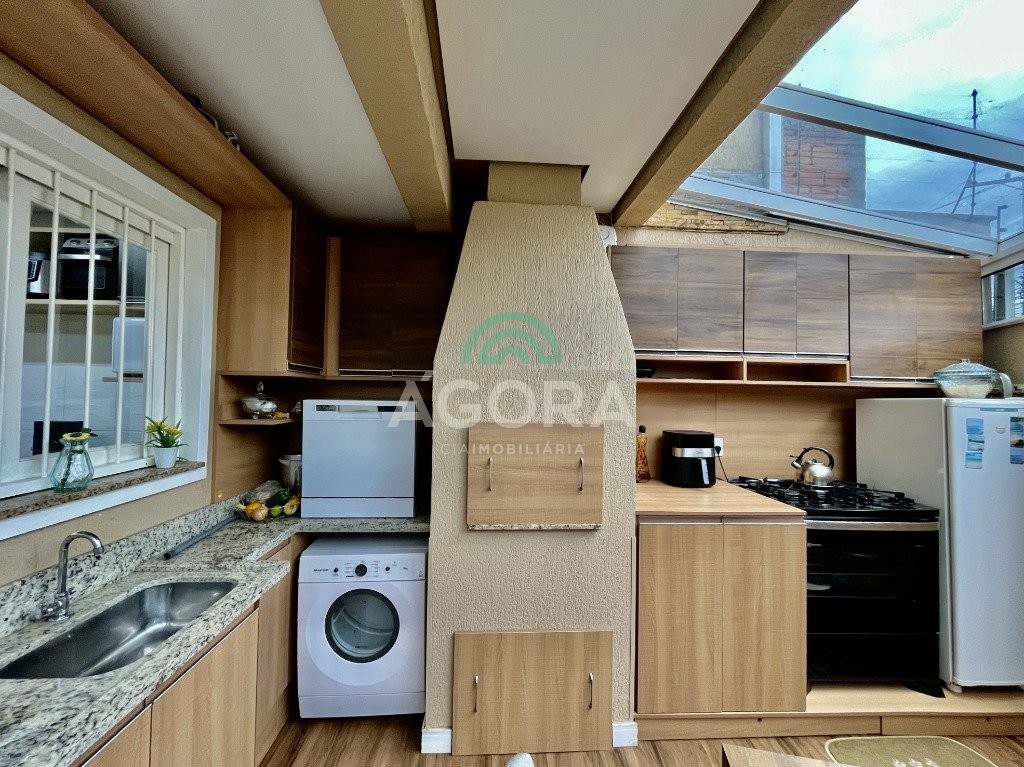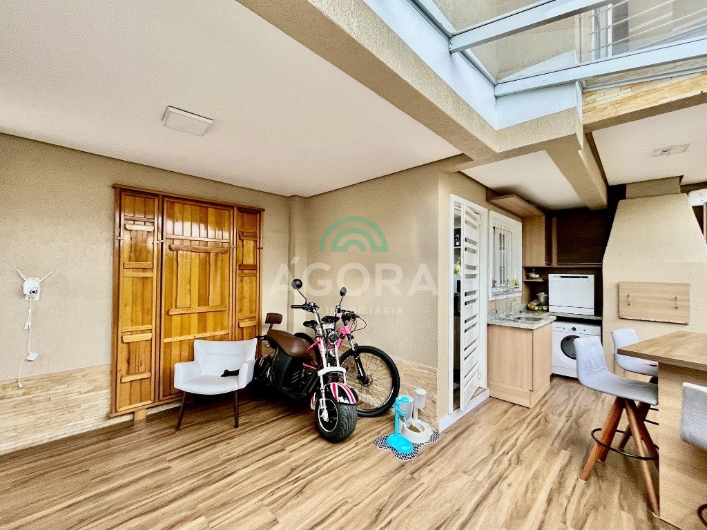 Sobrado de esquina com excelente posição solar e ventilação, de 164 m² privativos. Possui 3 (três) dormitórios, sendo 1 (uma) suíte com closet, e sacada. Living integrado entre sala de estar com lareira, sala de jantar e cozinha. 1 (um) banheiro social e 1 (um) lavabo. Pátio fechado com espaço gourmet completo e garagem coberta para 2 (dois) veículos. Permanece no imóvel todos os móveis fixos de excelente qualidade e acabamento e aparelhos de ar condicionado. O imóvel possui também placas fotovoltaicas. Cerca elétrica e câmeras. Localizado no bairro mato grande em canoas. Próximo aos principais comércios como mercados, farmácias, ferragens, postos, etc. Região de fácil acesso para br 116 e 448.
