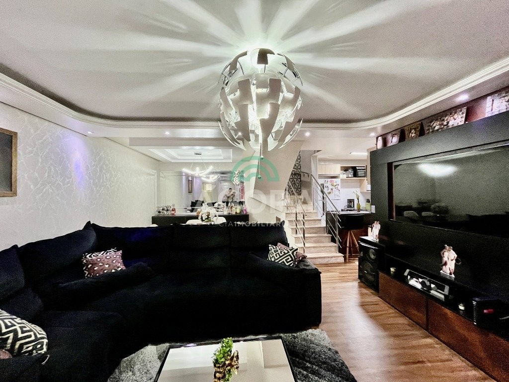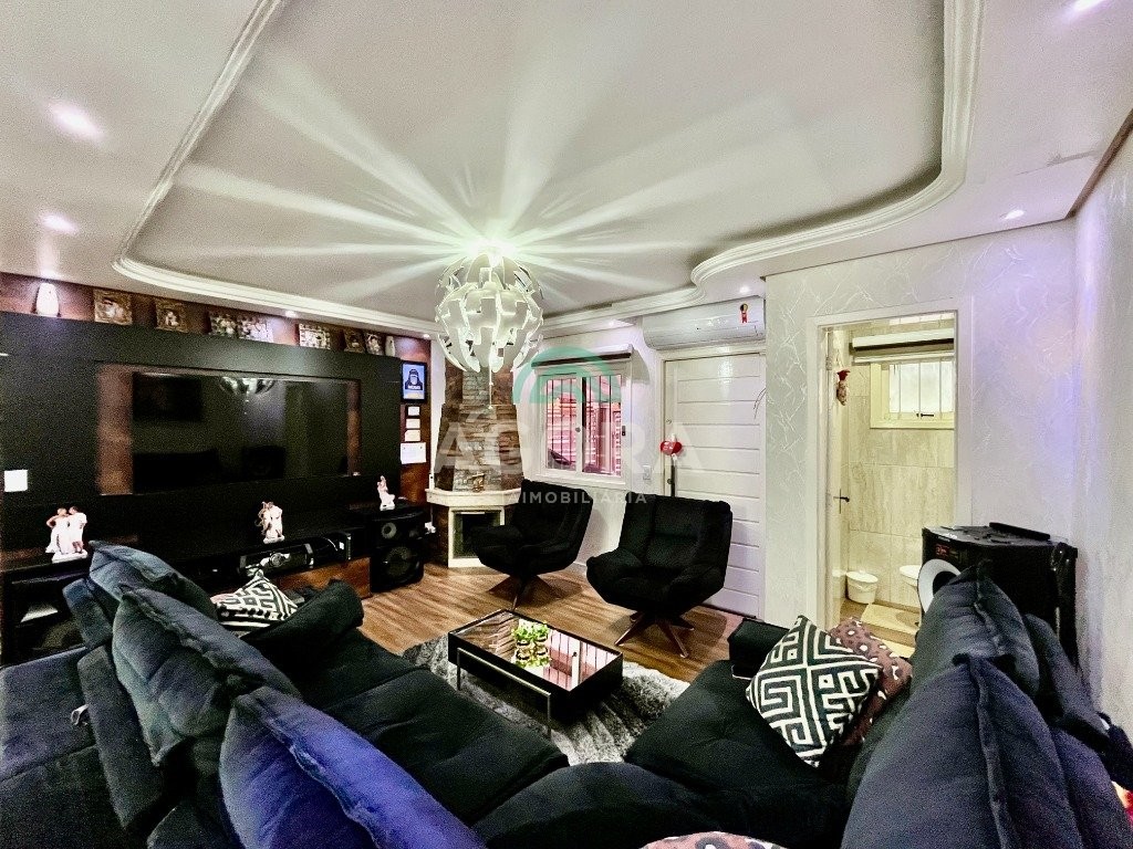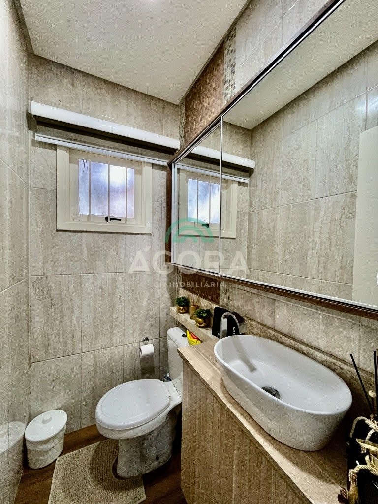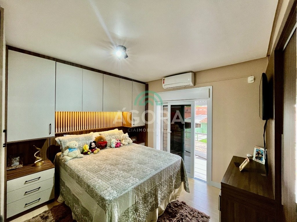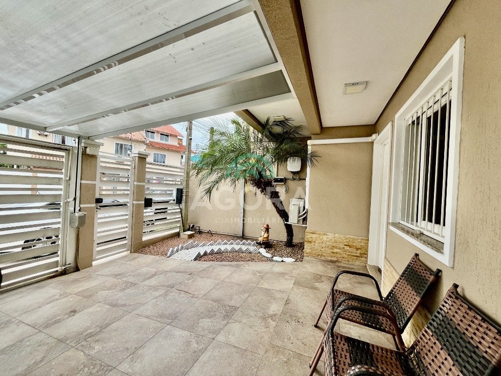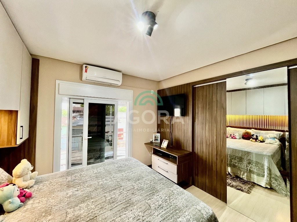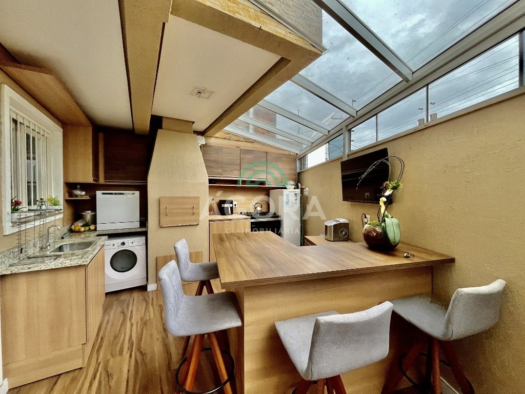 Sobrado de esquina com excelente posição solar e ventilação, de 164 m² privativos. Possui 3 (três) dormitórios, sendo 1 (uma) suíte com closet, e sacada. Living integrado entre sala de estar com lareira, sala de jantar e cozinha. 1 (um) banheiro social e 1 (um) lavabo. Pátio fechado com espaço gourmet completo e garagem coberta para 2 (dois) veículos. Permanece no imóvel todos os móveis fixos de excelente qualidade e acabamento e aparelhos de ar condicionado. O imóvel possui também placas fotovoltaicas. Cerca elétrica e câmeras. Localizado no bairro mato grande em canoas. Próximo aos principais comércios como mercados, farmácias, ferragens, postos, etc. Região de fácil acesso para br 116 e 448.