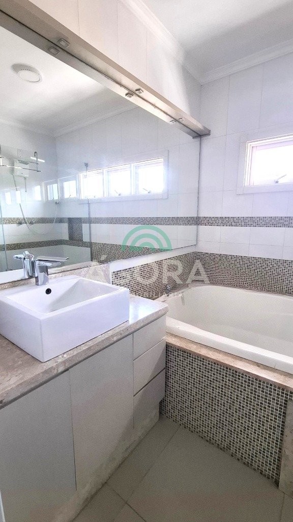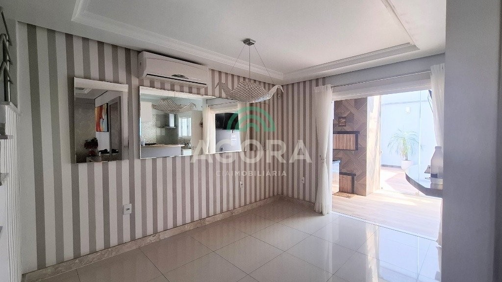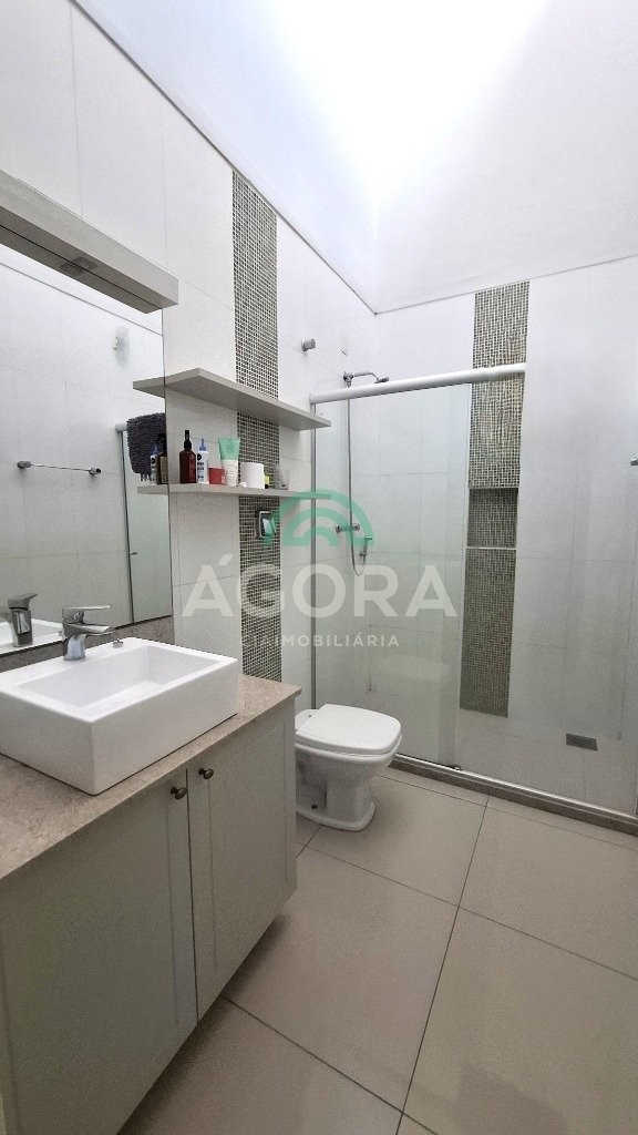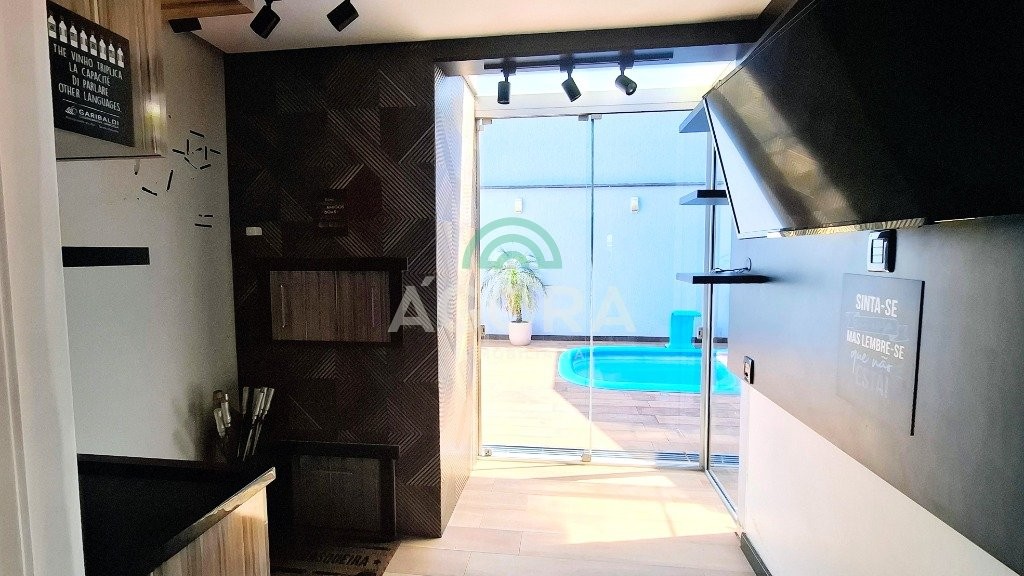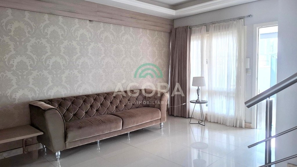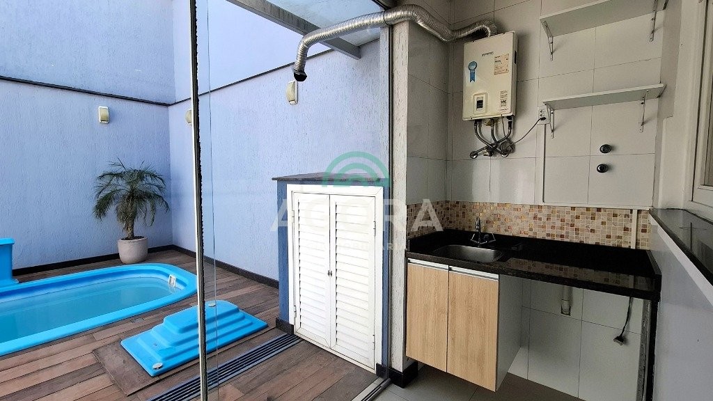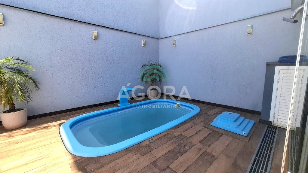 Ágora Cia Imobiliária vende: Sobrado com 3 (três) dormitórios, sendo 1 (uma) suíte máster com sacada, closet e hidro no banheiro. Subindo a escada, tem um espaço que pode ser utilizado como uma sala de TV , leitura ou escritório. Possui sala de estar, sala de jantar e cozinha integrada. Lavanderia separada. Espaço com churrasqueira rotativa e nos fundos 1 (um) pátio com piscina para aproveitar com a família e amigos. Possui garagem coberta para 2 (dois) carros. Casa possui placas solares, sistema de câmeras e alarme. Ficam na casa os móveis fixos e split na sala.