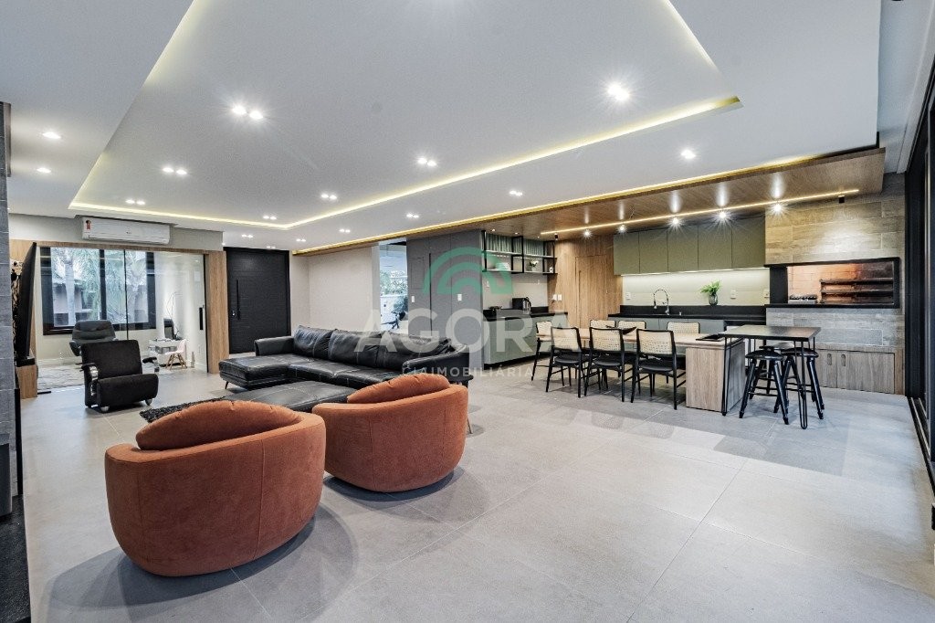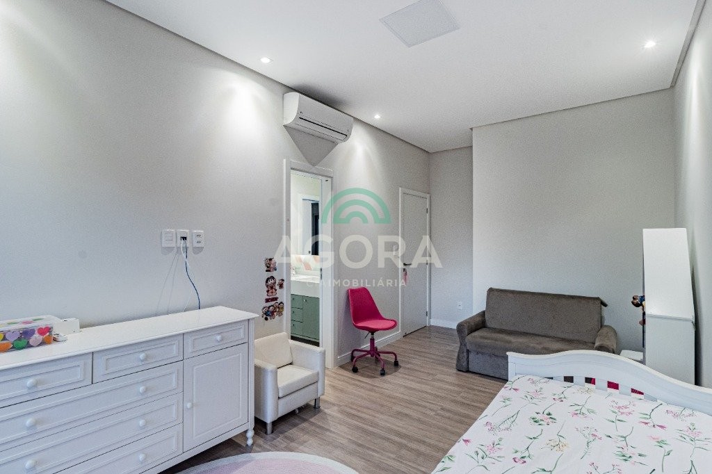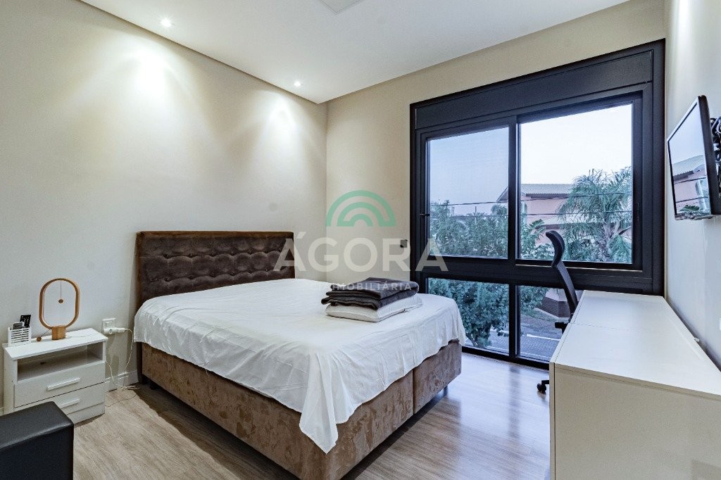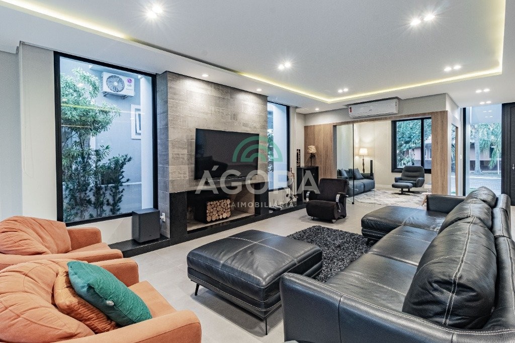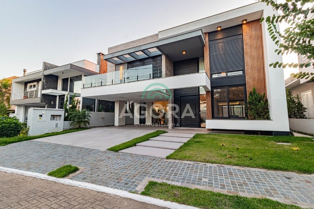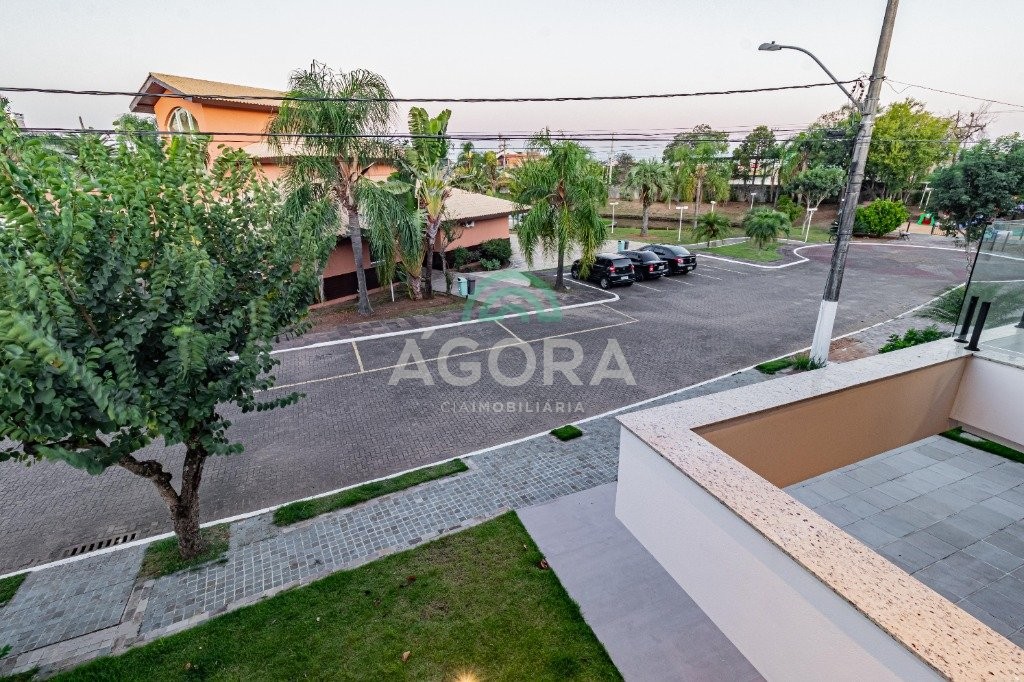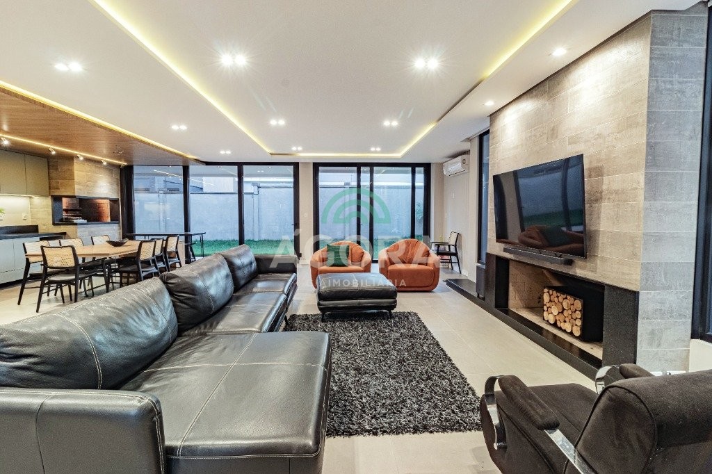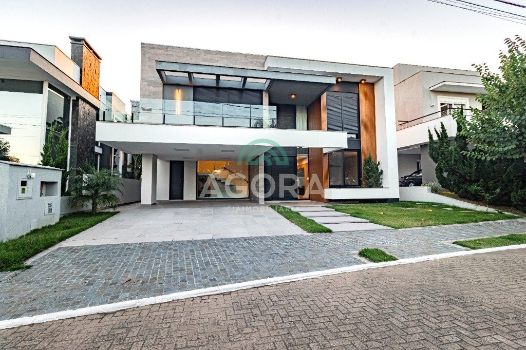 Infra completa alto padrão sobrado em condomínio de alto padrão, semimobiliado, de 318m² de área construída, conceito aberto e piso em porcelanato. Parte térrea: living com 2 (dois) ambientes distintos e integrados, lareira, escada revestida em mármore, lavabo, suíte completa, persianas automatizadas na casa, copa e cozinha com passa pratos, lavanderia, espaço de lazer com churrasqueira e pergolado. Parte superior: estar íntimo no mezanino, 4 (quatro) suítes, sendo 2 (duas) delas suíte master com sacada, outra conta com um terraço, e hidro. Terreno com 433m². Paisagismo com irrigação automática, cisterna com recolhimento de água da chuva. Garagem coberta para 2 (dois) carros lado a lado e mais 2 (duas) vagas descobertas. Condomínio fechado com toda a infraestrutura, portaria 24h, sistema integrado de segurança com comunicação inteligente salão de festas, quadra de esportes, quadra fechada de saibro para tênis, lago com peixes, espaços de convivência, piscina com raia, campo de futebol e gás canalizado.