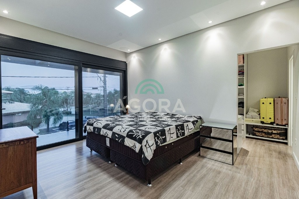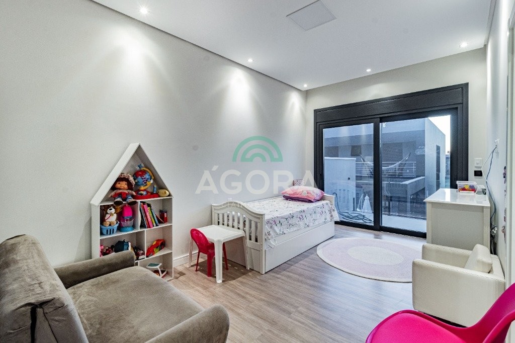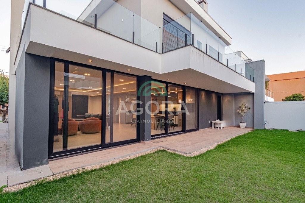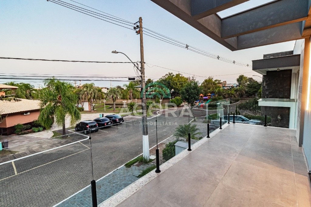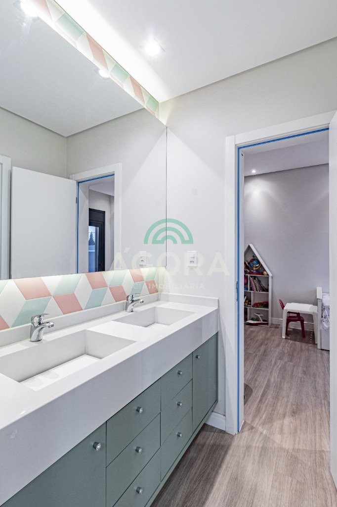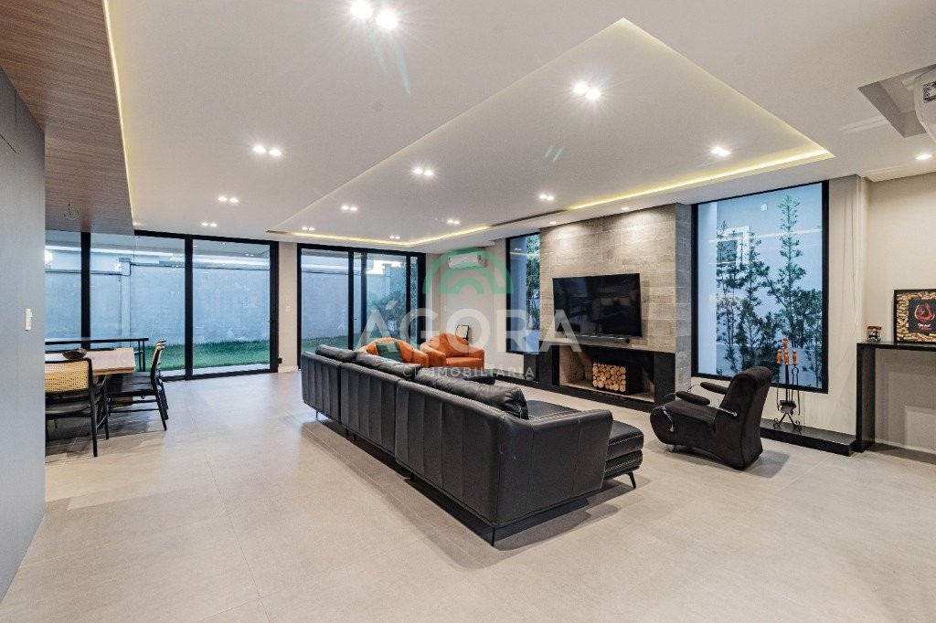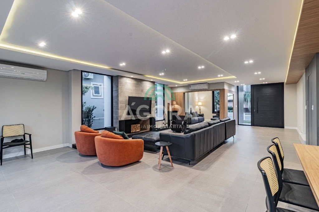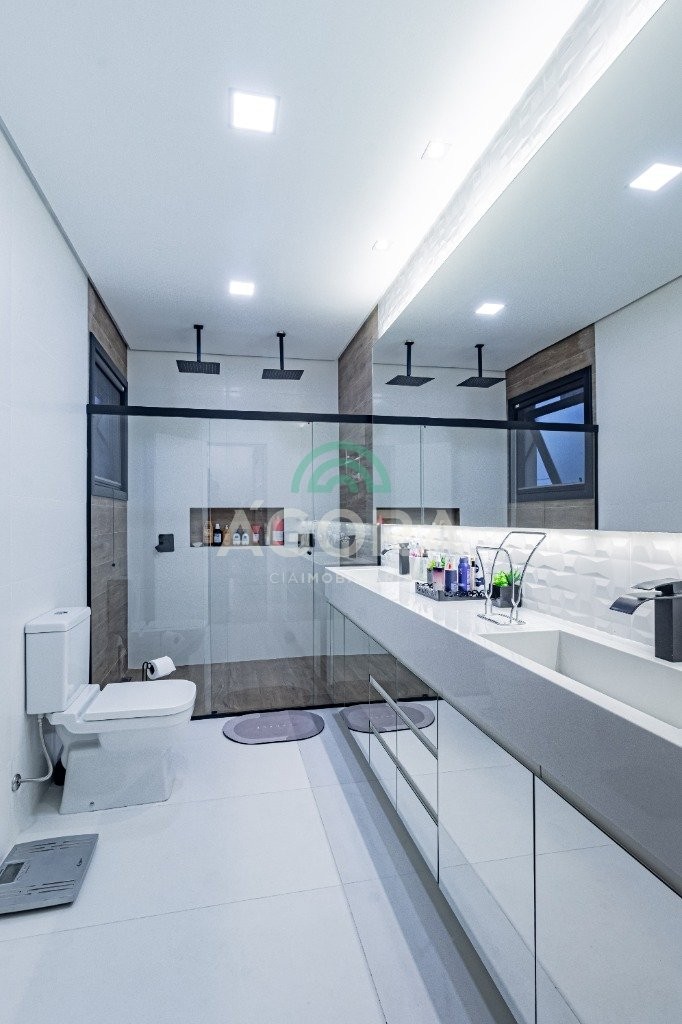 Infra completa alto padrão sobrado em condomínio de alto padrão, semimobiliado, de 318m² de área construída, conceito aberto e piso em porcelanato. Parte térrea: living com 2 (dois) ambientes distintos e integrados, lareira, escada revestida em mármore, lavabo, suíte completa, persianas automatizadas na casa, copa e cozinha com passa pratos, lavanderia, espaço de lazer com churrasqueira e pergolado. Parte superior: estar íntimo no mezanino, 4 (quatro) suítes, sendo 2 (duas) delas suíte master com sacada, outra conta com um terraço, e hidro. Terreno com 433m². Paisagismo com irrigação automática, cisterna com recolhimento de água da chuva. Garagem coberta para 2 (dois) carros lado a lado e mais 2 (duas) vagas descobertas. Condomínio fechado com toda a infraestrutura, portaria 24h, sistema integrado de segurança com comunicação inteligente salão de festas, quadra de esportes, quadra fechada de saibro para tênis, lago com peixes, espaços de convivência, piscina com raia, campo de futebol e gás canalizado.