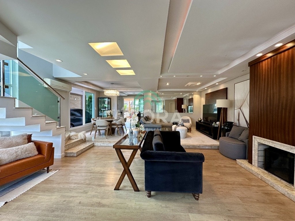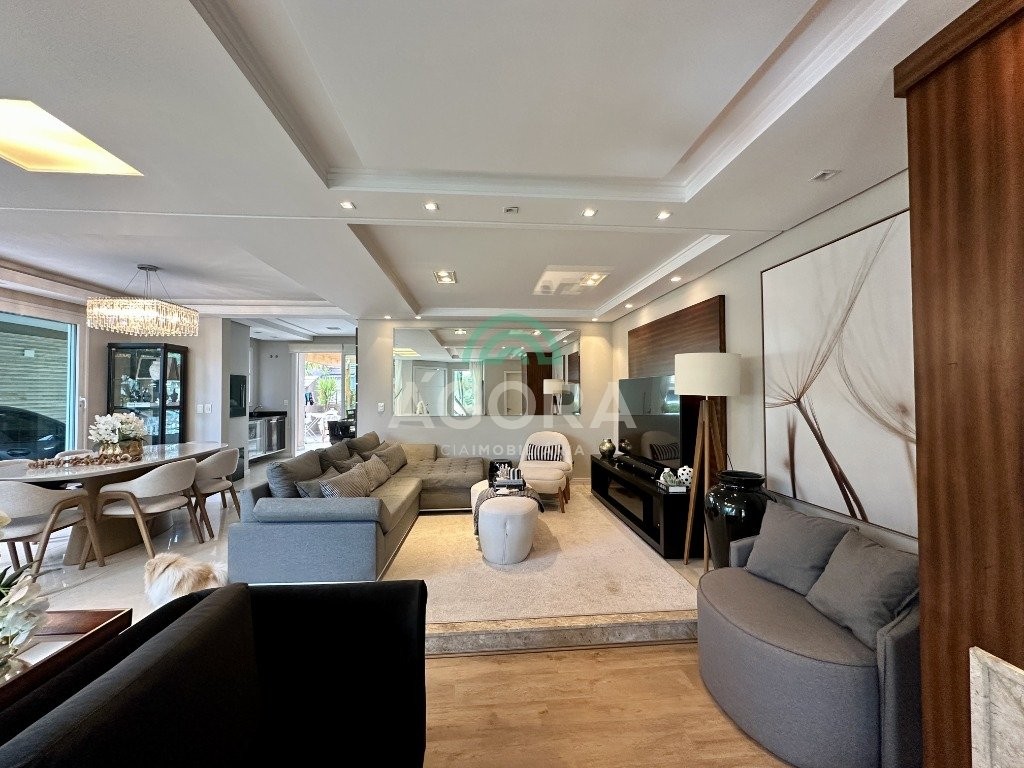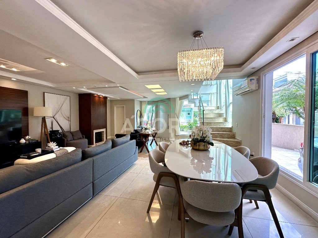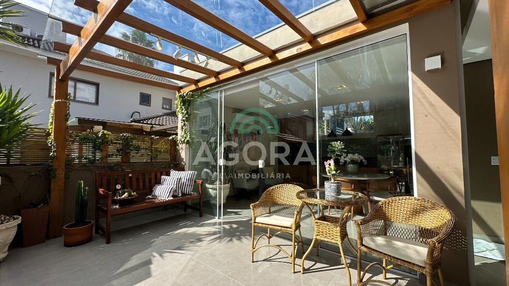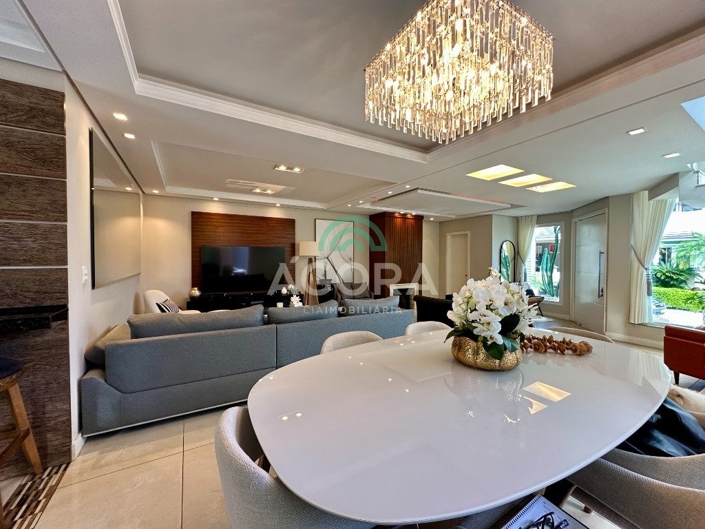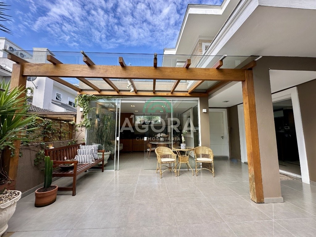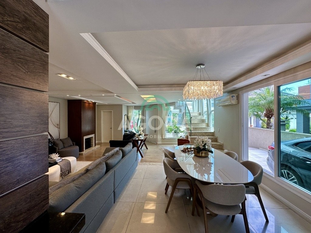 Sobrado totalmente mobiliado de 280m² privativos com 4 (quatro) dormitórios, sendo 1 (uma) suíte com closet, banheira e sacada. Amplo espaço de living com lareira, cozinha separada com churrasqueira, mezanino com sacada, espaço aos fundos climatizado com área gourmet completa e mais um espaço livre. Possui 3 (três) vagas para veículos. Condomínio com infraestrutura completa!