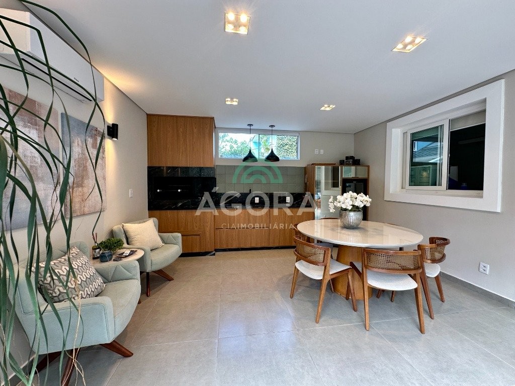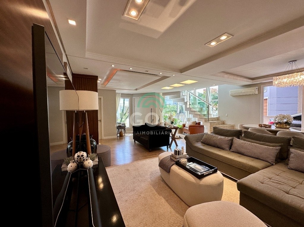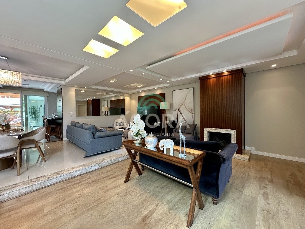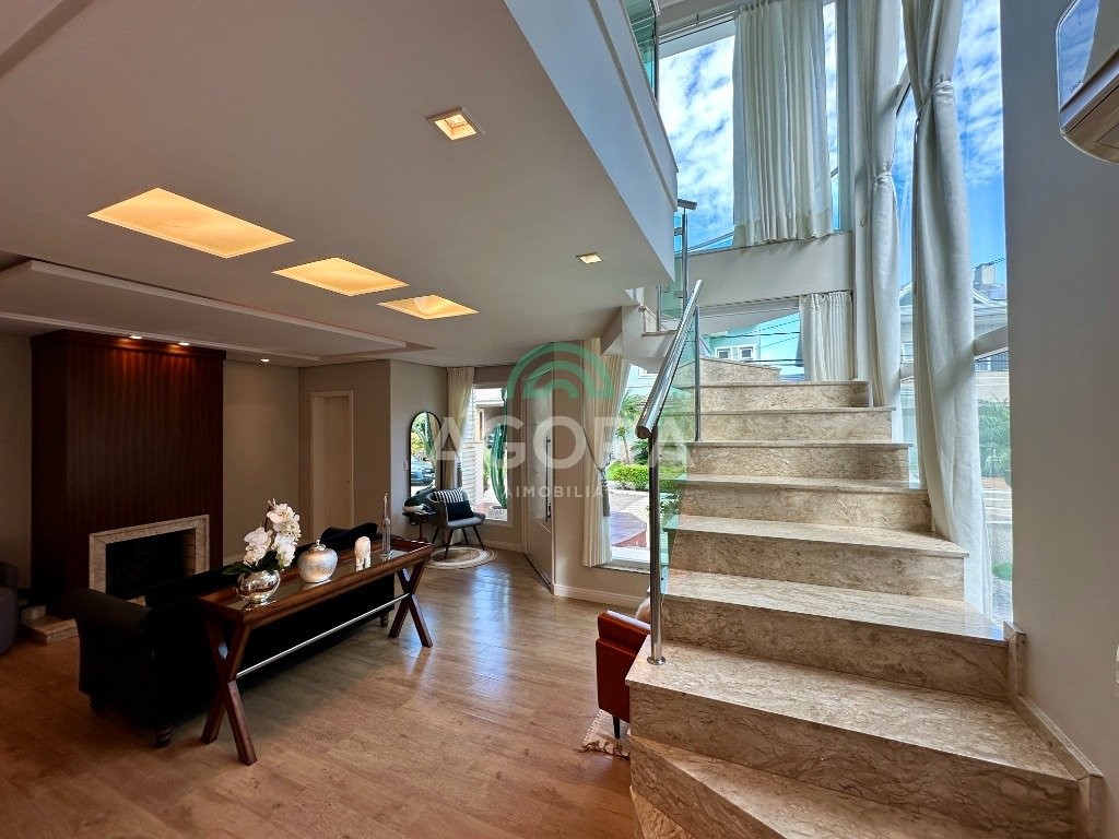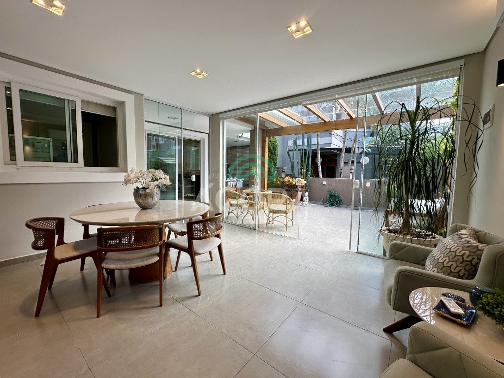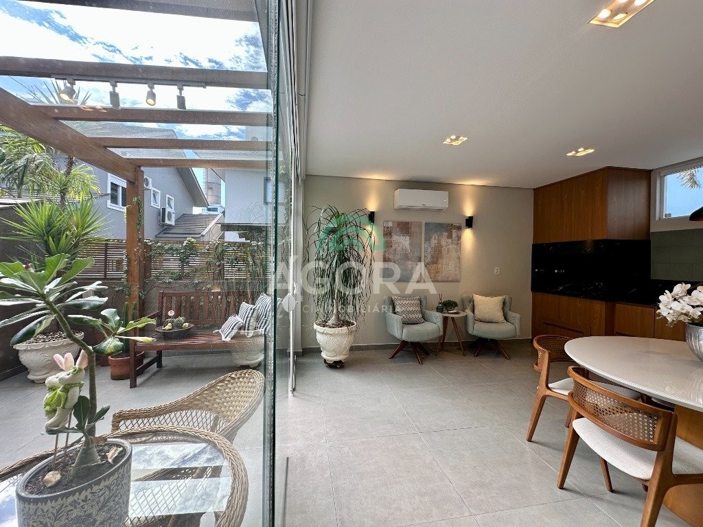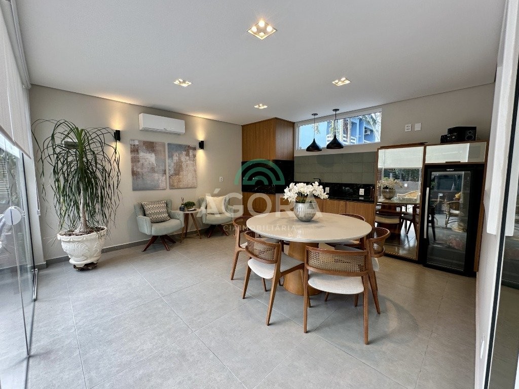 Sobrado totalmente mobiliado de 280m² privativos com 4 (quatro) dormitórios, sendo 1 (uma) suíte com closet, banheira e sacada. Amplo espaço de living com lareira, cozinha separada com churrasqueira, mezanino com sacada, espaço aos fundos climatizado com área gourmet completa e mais um espaço livre. Possui 3 (três) vagas para veículos. Condomínio com infraestrutura completa!