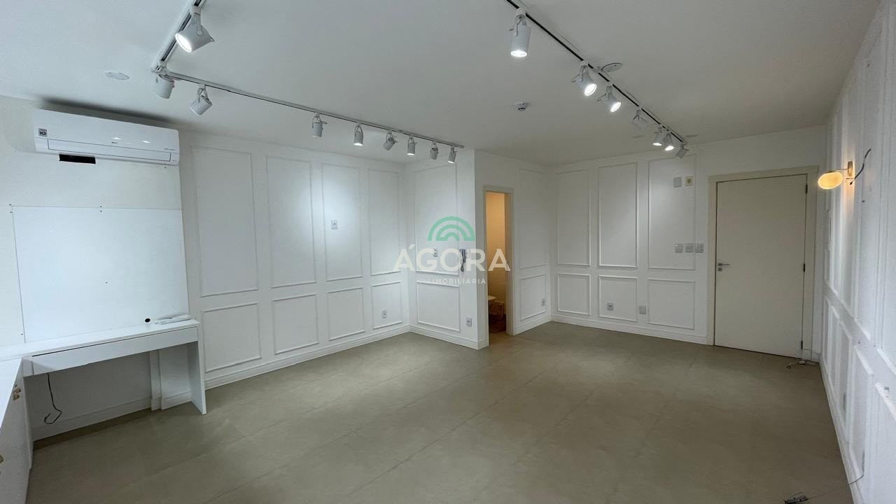 Sala comercial com 34,08m², 2 vagas de garagem, amplas janelas em pele de vidro, proporcionando excelente luminosidade e conforto térmico. Lavabo, piso em porcelanato, armário abaixo da janela, luminárias, molduras de embelezamento nas paredes. Prédio conta com portaria presencial durante horário comercial e remota fora do expediente, dois elevadores, cafeteria no térreo. Aluguel mais encargos