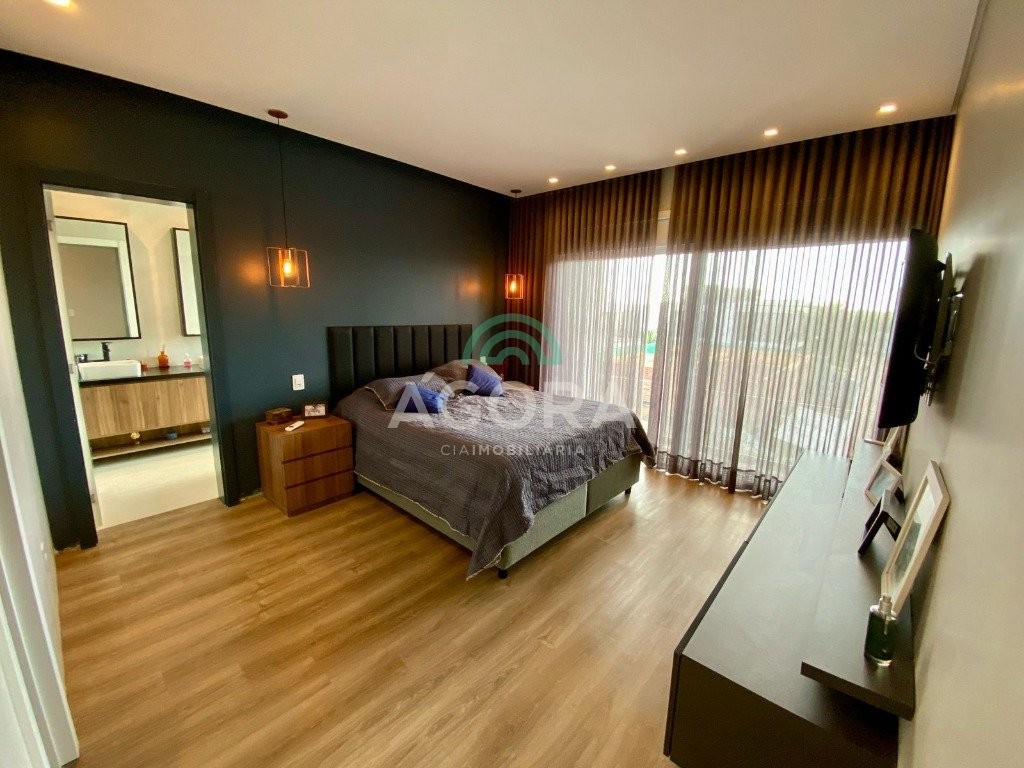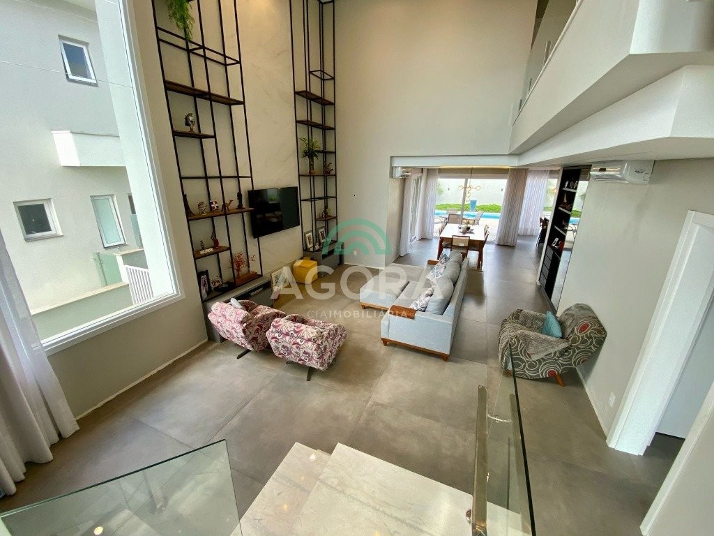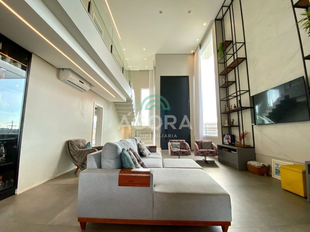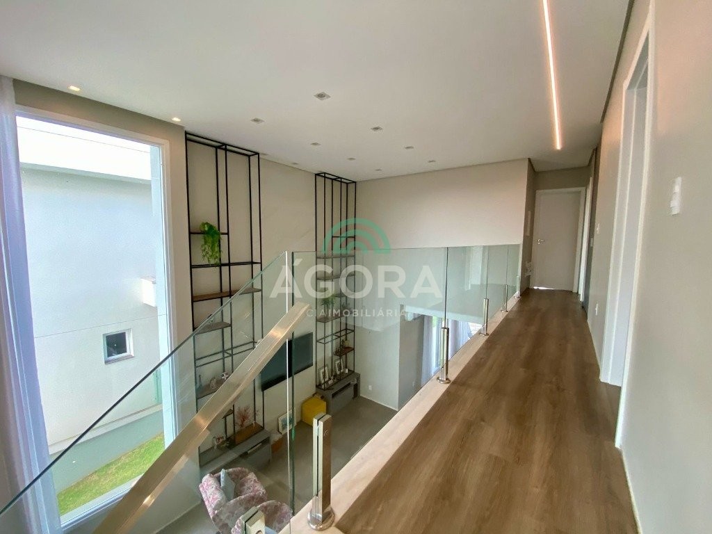 Infra completa alto padrão Ágora Cia Imobiliária vende: Sobrado em condomínio de alto padrão, semimobiliado, de 318m² de área construída, conceito aberto e piso em porcelanato. Parte térrea: Living com 2 (dois) ambientes distintos e integrados, lareira, escada revestida em mármore, lavabo, suíte completa, persianas automatizadas na casa, copa e cozinha com passa pratos, lavanderia, espaço de lazer com churrasqueira e pergolado. Parte superior: Estar íntimo no mezanino, 4 (quatro) suítes, sendo 2 (duas) delas suíte master com sacada, outra conta com um terraço, e hidro. Terreno com 433m². Paisagismo com irrigação automática, cisterna com recolhimento de água da chuva. Garagem coberta para 2 (dois) carros lado a lado e mais 2 (duas) vagas descobertas. Condomínio fechado com toda a infraestrutura, portaria 24h, sistema integrado de segurança com comunicação inteligente salão de festas, quadra de esportes, quadra fechada de saibro para tênis, lago com peixes, espaços de convivência, piscina com raia, campo de futebol e gás canalizado.