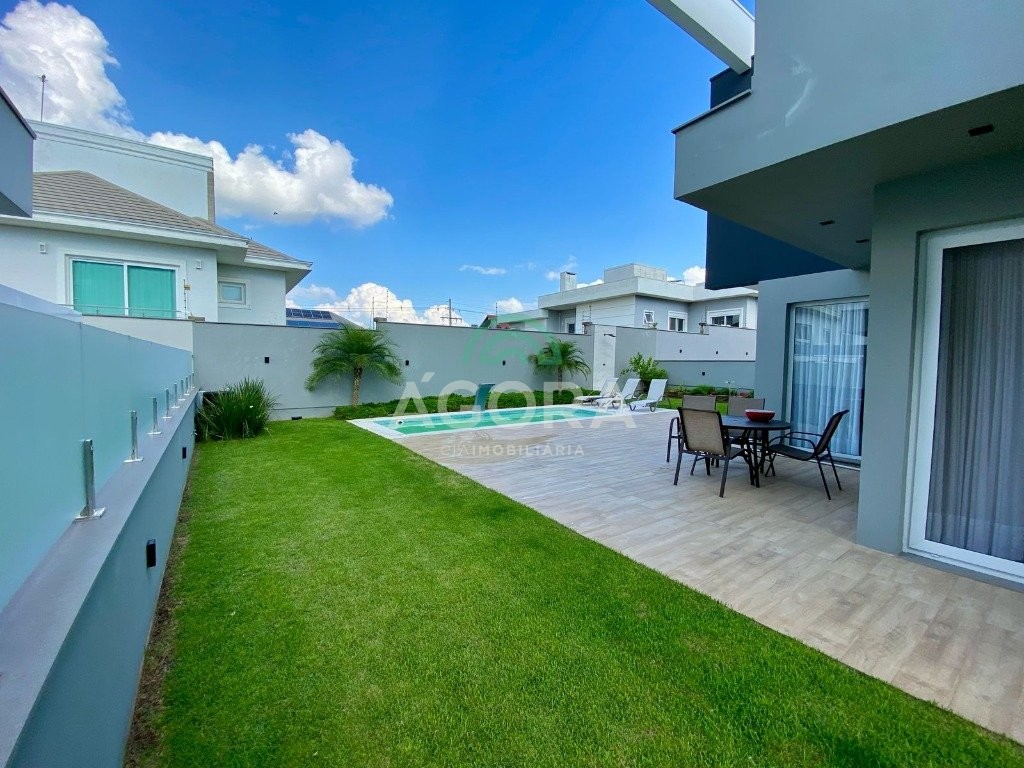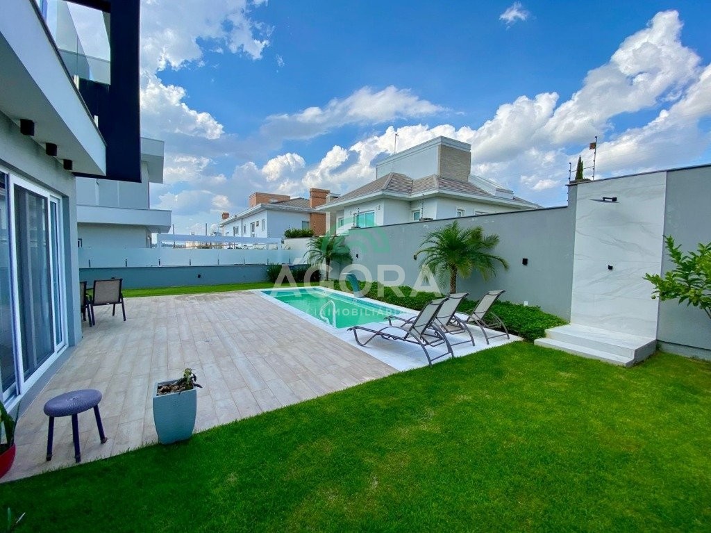 Sobrado mobiliado em condomínio de alto padrão de 296m², com 3 (três) dormitórios, sendo 2 (duas) suítes com closet, 1 (um) escritório, 2 (dois) depósitos, pé direito duplo, rebaixo em gesso, área gourmet, churrasqueira com parrilha, aberturas em pvc, persianas automatizadas, piscina aquecida e 4 (quatro) vagas. ótima localização.