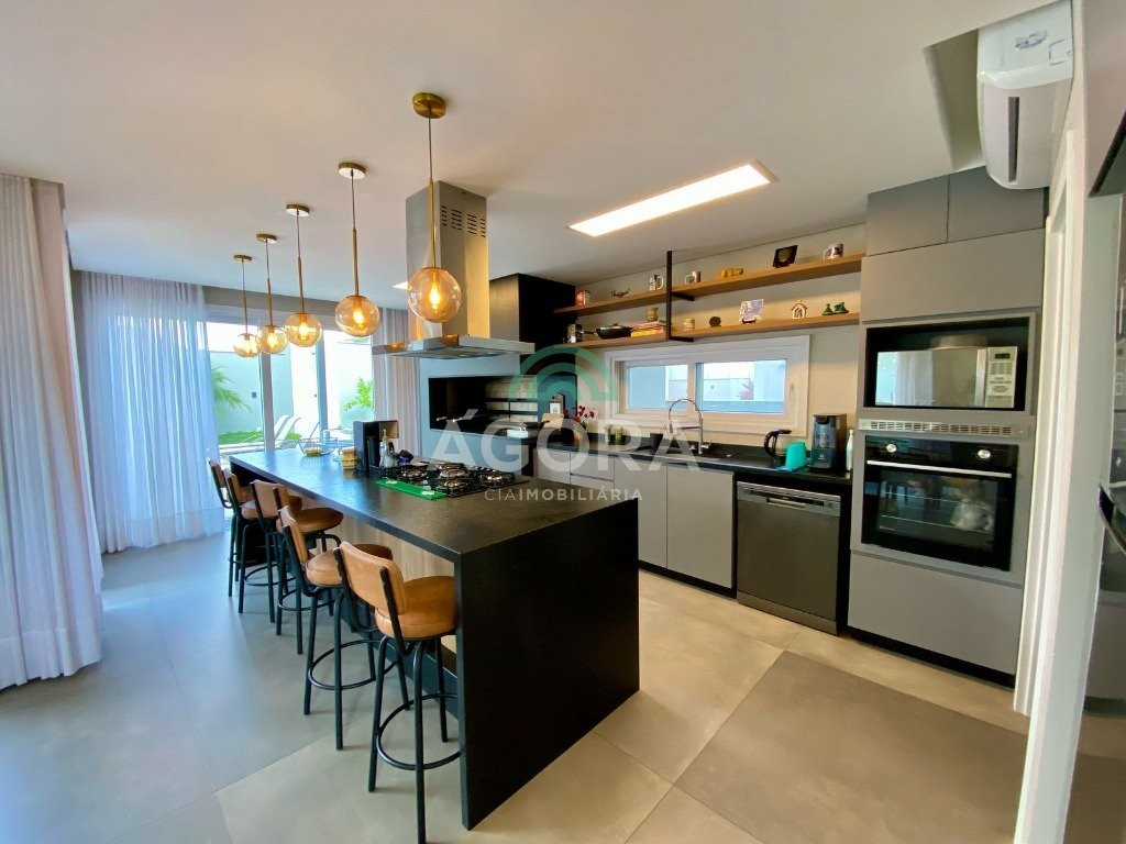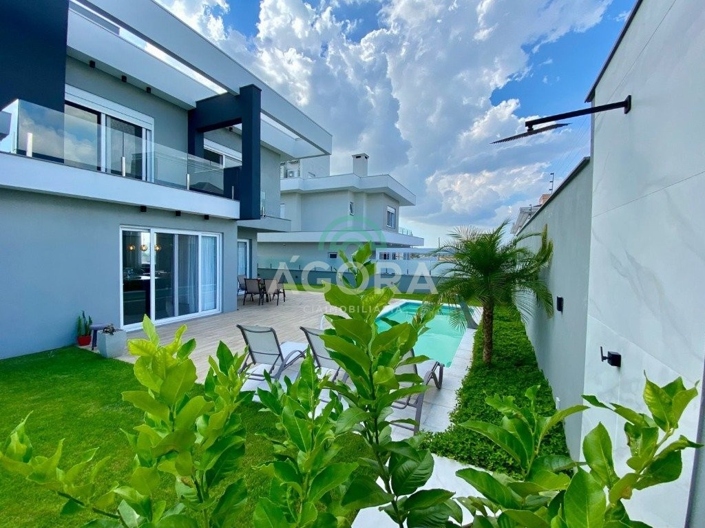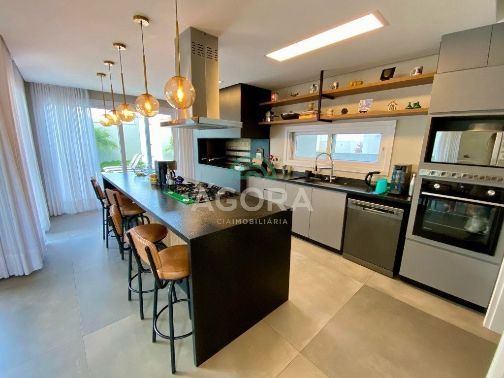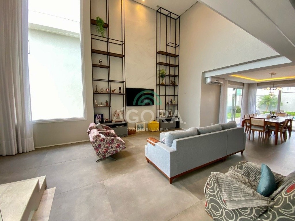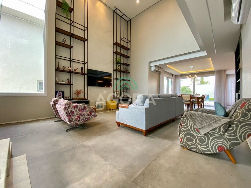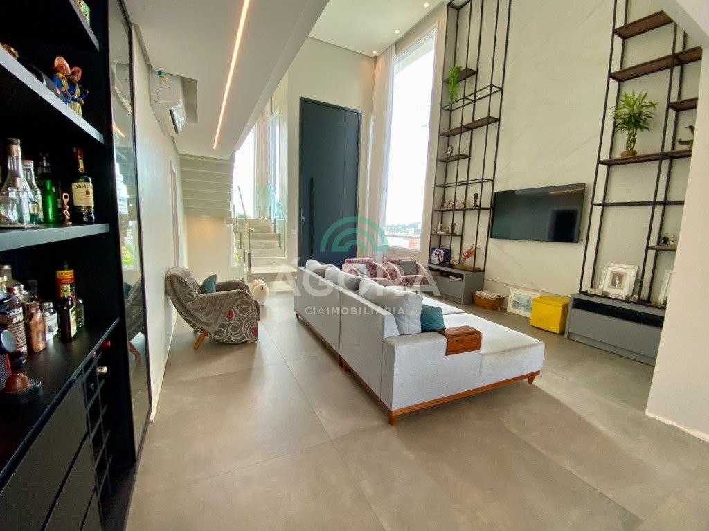 Ágora Cia Imobiliária vende: Sobrado mobiliado de alto padrão em condomínio fechado com 329m² privativos, construídos em um terreno único com 17m de frente, Com 4 (quatro) dormitórios, sendo 1 (uma) suíte master com e 2 (duas) suítes tradicionais e 1 (uma) dormitório no térreo. Living integrado entre sala de estar com lareira, sala e jantar e cozinha, com pé direito duplo e acabamentos em alta qualidade. Pátio privativos aos fundos coberto com teto retrátil e piscina aquecida. Garagem para 4 (quatro) veículos, sendo 2 (duas) vagas cobertas. O imóvel permanece mobiliado, com 4 aparelhos de splits e Juncker. Condomínio com infraestrutura completa. Ambiente seleto e tranquilo, com segurança 24h. Fácil acesso e próximo a todo o comércio local.