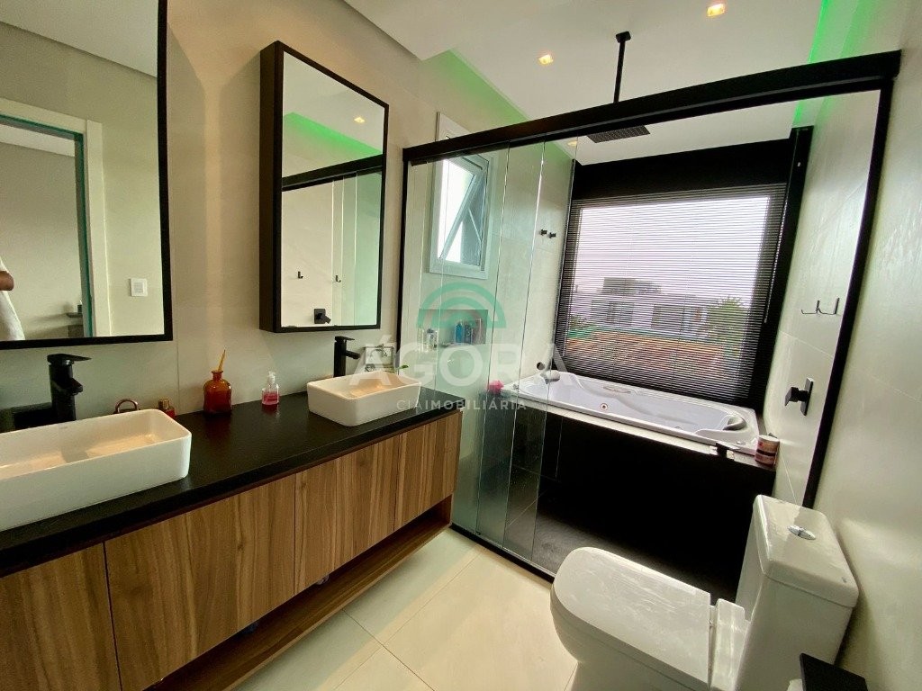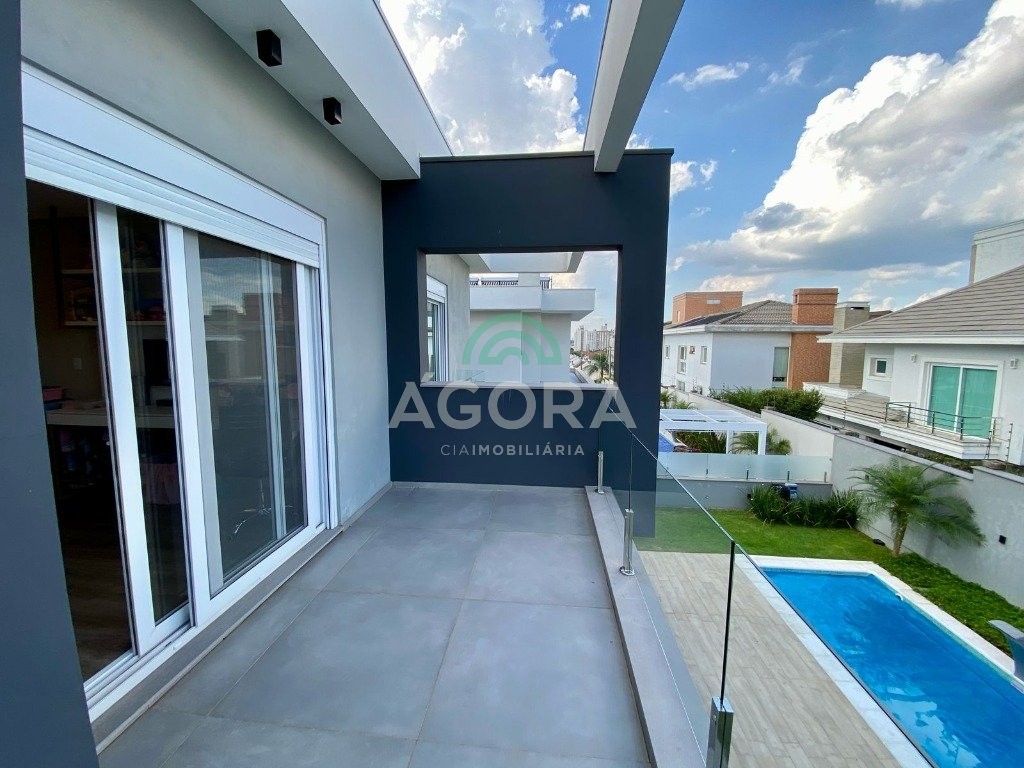 Ágora Cia Imobiliária vende: Sobrado em condomínio fechado com 316m² privativos e um projeto contemporâneo com acabamento em alto padrão. Com 4 (quatro) suítes, sendo 1 (uma) suíte no térreo e a Suíte Master com 43m² privativos com vista para a área verde do condomínio, TODOS com persianas automatizadas. Espera para elevador Living integrado com 3 (três) ambientes Pátio privativo aos fundos com piscina em concreto e lavabo externo. Projeto pensado para facilitar sua dia a dia, com automação de iluminação com Alexa e Jardim com irrigação Condomínio com infraestrutura completa, fácil acesso e próximo a todo o comércio local.