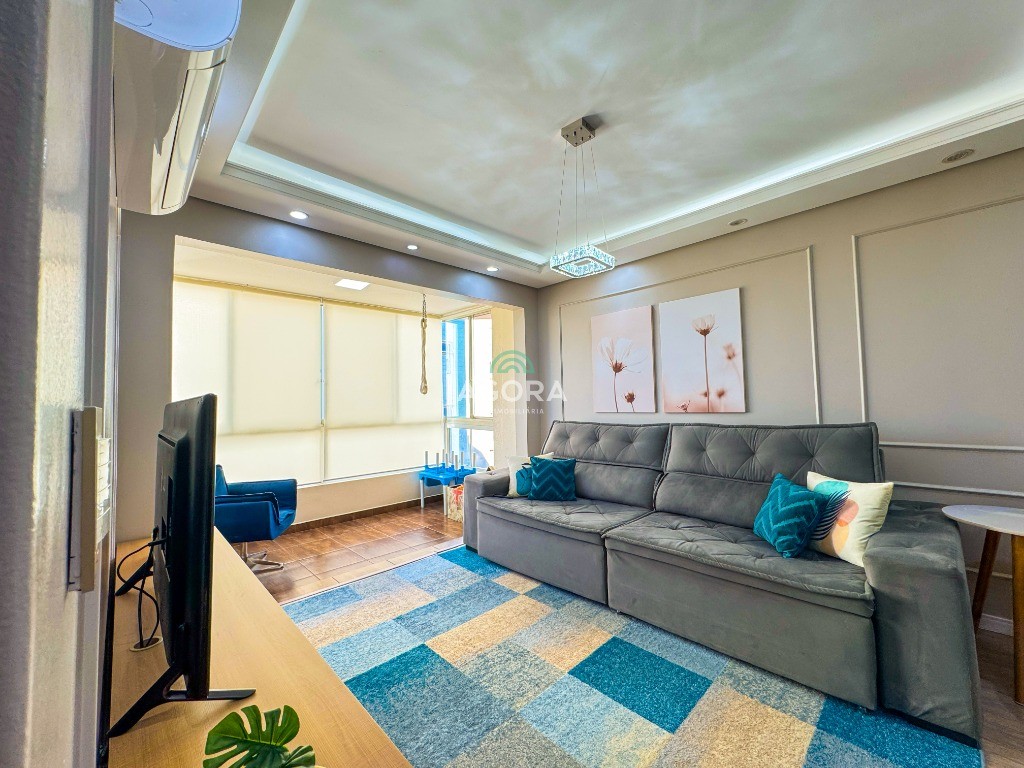 Apartamento de 93,38 m² com 3 dormitórios e sacada com churrasqueira.