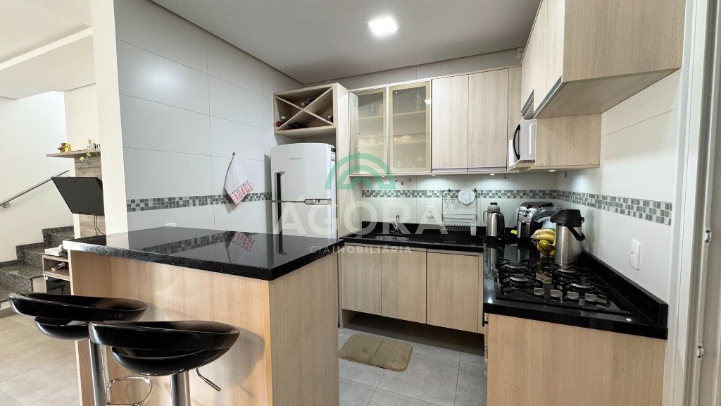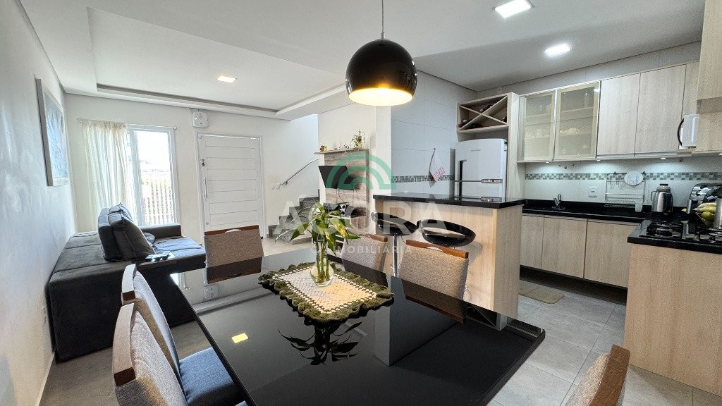 Excelente sobrado de 93,47m² privativos; composto de 2 (duas) suítes, sendo 1 (uma) suíte com sacada, living de 3 (três) ambientes com sala de estar, sala de jantar e cozinha integrada e lavabo. Na parte dos fundos: Área de serviço, churrasqueira, bancada em granito; teto retrátil em policarbonato uv mantendo a iluminação natural e protegendo do calor e chuva. Vaga para 2 (dois) veículos lado a lado. Excelente padrão de acabamento. Permanecem no imóvel todos os móveis sob medida; incluindo luminárias, aquecedor a gás e alarme central com cerca elétrica e câmeras externas de vigilância. Localizado numa das regiões mais nobres da cidade o bairro igara, com fácil acesso a br-116 - aceita financiamento