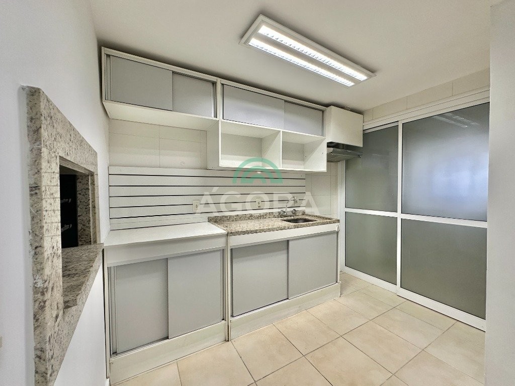 Apartamento de 93,38 m² com 3 dormitórios e sacada com churrasqueira.