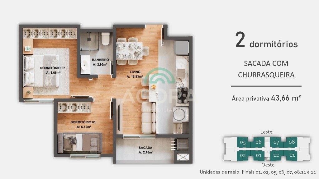 Apartamento de 67m² com 2 dormitórios e sacada.