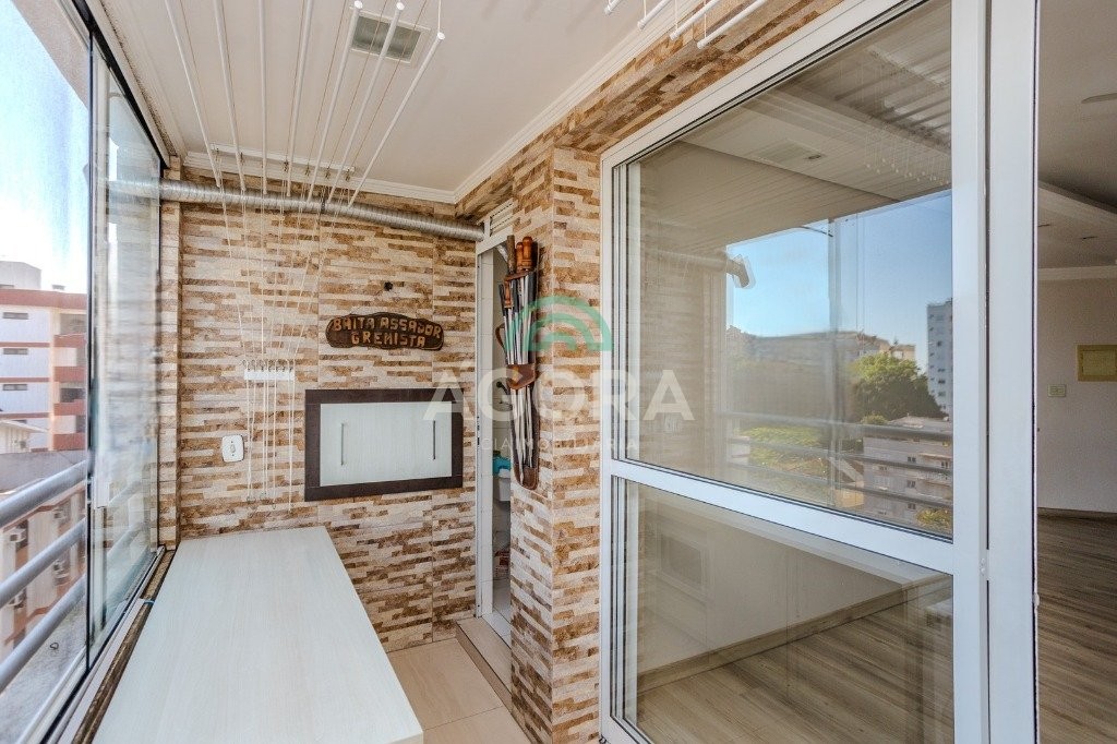 Apartamento de 93,38 m² com 3 dormitórios e sacada com churrasqueira.