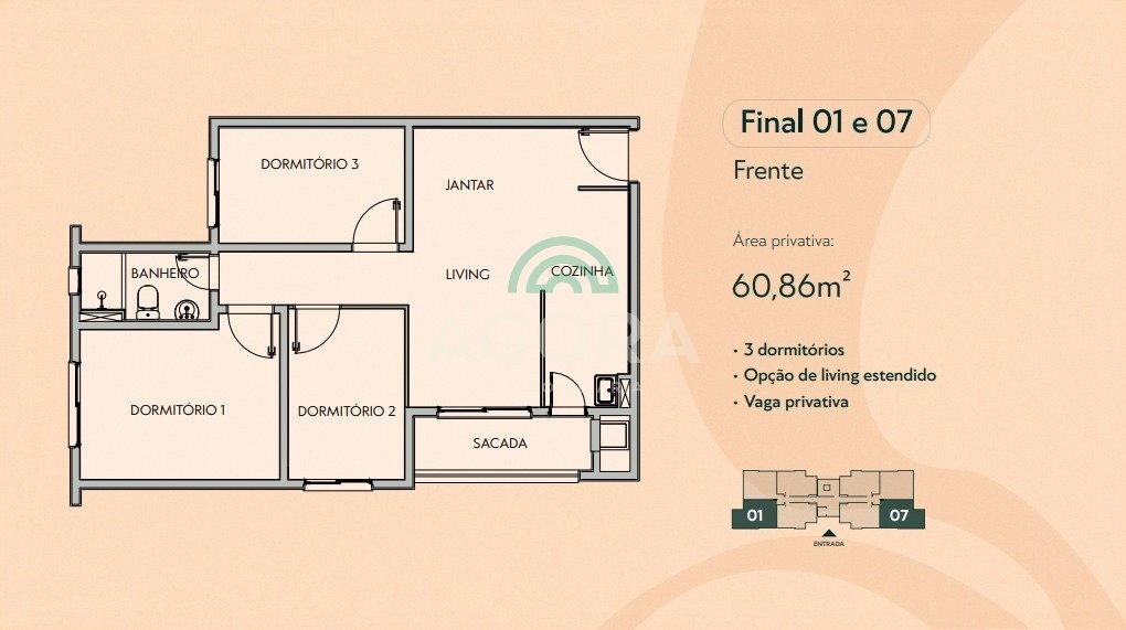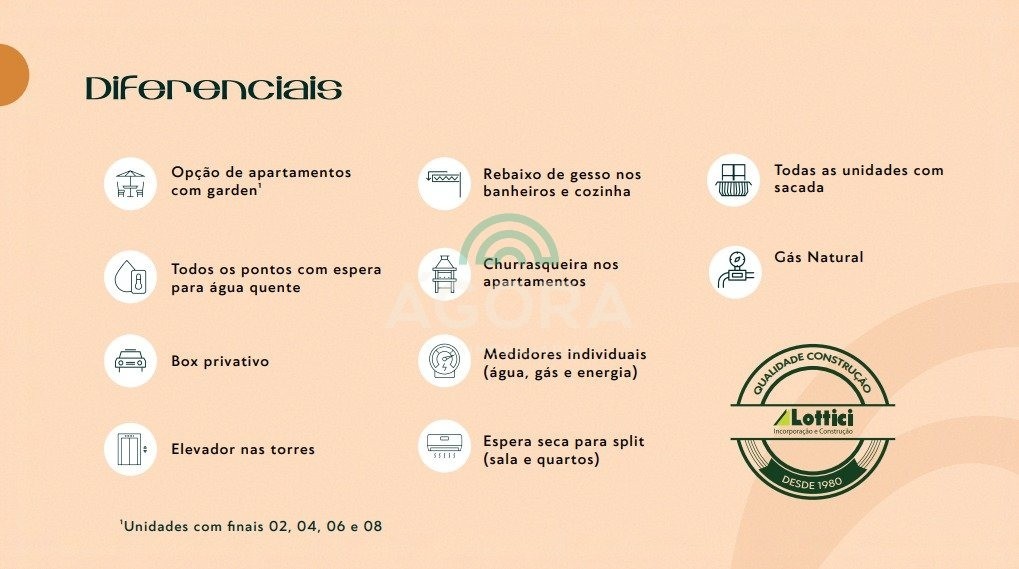 Ágora cia imobiliária vende: Ágora cia imobiliária vende: condomínio residencial ora conceito - valorização do tempo - o bem mais precioso da vida - inspirado em viver o presente com plenitude - conexão entre estabilidade e as nuances da vida localização - rua pirapó, 1553 - bairro igara, canoas - fácil acesso à br-116 - próximo a ulbra, escolas, hotel e pousada, quadra esportiva, mercado, academia, praça, restaurante e shopping o empreendimento - 7 torres residenciais - 9 andares cada - 8 apartamentos por andar - 4 apartamentos garden por torre - total de 497 unidades ficha técnica - apartamentos de 2 e 3 dormitórios - opção de living estendido - todas as unidades com sacada - Área privativa aproximada de 48,94m² a 60,86m² - rebaixo de gesso em banheiros e cozinha - espera para Água quente - espera para split em sala e quartos - churrasqueira nos apartamentos - medidores individuais de Água, gás e energia - gás natural - box privativo - elevador em todas as torres áreas de lazer e convivência - salão de festas - espaço gourmet - quiosques com churrasqueira - piscinas adulto e infantil - brinquedoteca e playground - sala de jogos - quadra esportiva infantil - espaço pet - coworking - espaço multiuso infraestrutura e segurança - guarita - espaço delivery - marketplace interno - depósito de resíduos - escritório e copa de funcionários Ágora cia imobiliária vende: condomínio residencial ora (previsão 08/2028) conceito - valorização do tempo - o bem mais precioso da vida - inspirado em viver o presente com plenitude - conexão entre estabilidade e as nuances da vida localização - rua pirapó, 1553 - bairro igara, canoas - fácil acesso à br-116 - próximo a ulbra, escolas, hotel e pousada, quadra esportiva, mercado, academia, praça, restaurante e shopping o empreendimento - 7 torres residenciais - 9 andares cada - 8 apartamentos por andar - 4 apartamentos garden por torre - total de 497 unidades ficha técnica - apartamentos de 2 e 3 dormitórios - opção de living estendido - todas as unidades com sacada - Área privativa aproximada de 48,94m² a 60,86m² - rebaixo de gesso em banheiros e cozinha - espera para Água quente - espera para split em sala e quartos - churrasqueira nos apartamentos - medidores individuais de Água, gás e energia - gás natural - box privativo - elevador em todas as torres áreas de lazer e convivência - salão de festas - espaço gourmet - quiosques com churrasqueira - piscinas adulto e infantil - brinquedoteca e playground - sala de jogos - quadra esportiva infantil - espaço pet - coworking - espaço multiuso infraestrutura e segurança - guarita - espaço delivery - marketplace interno - depósito de resíduos - escritório e copa de funcionários