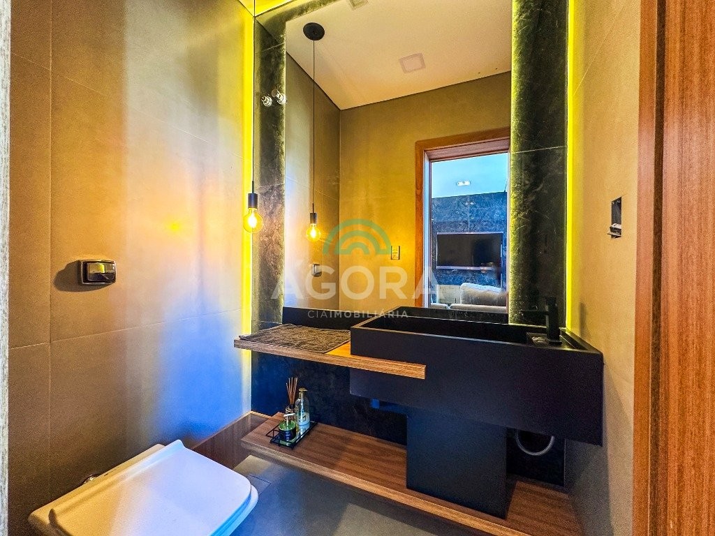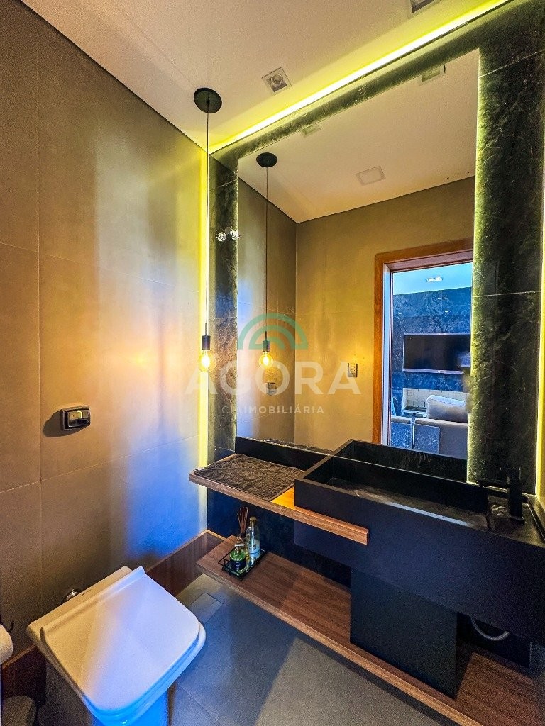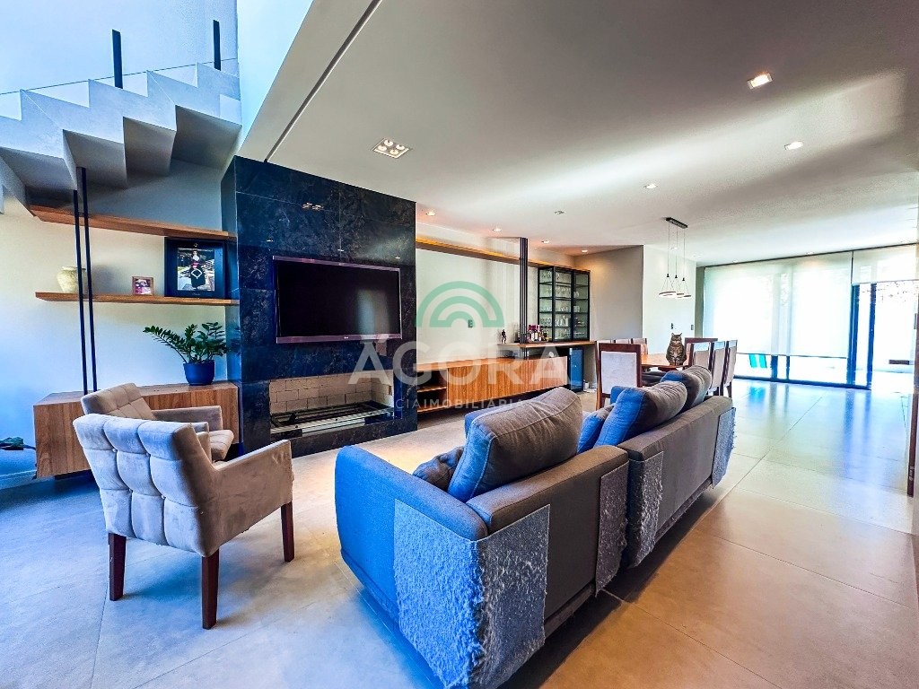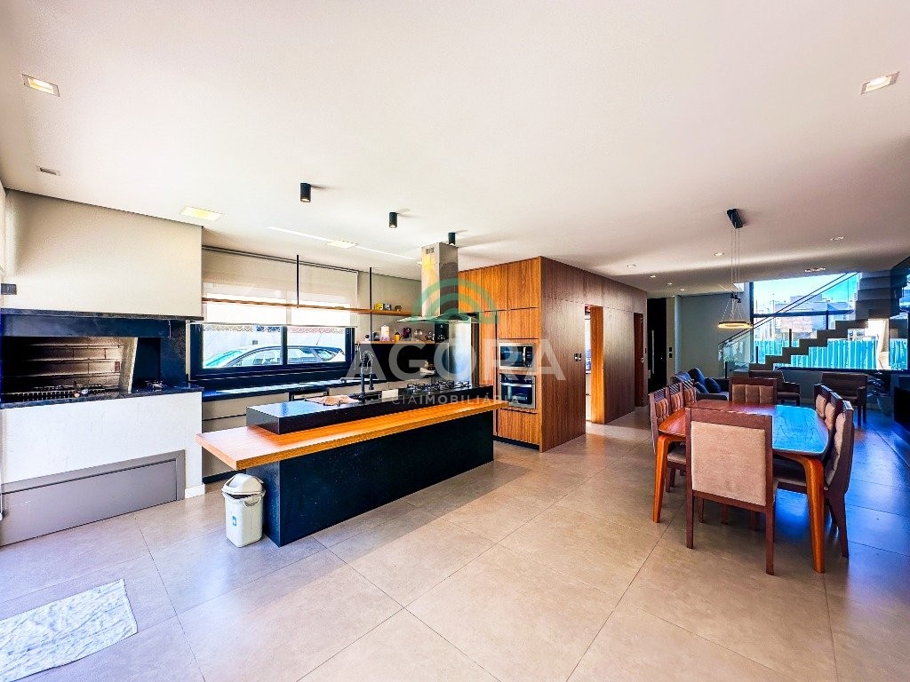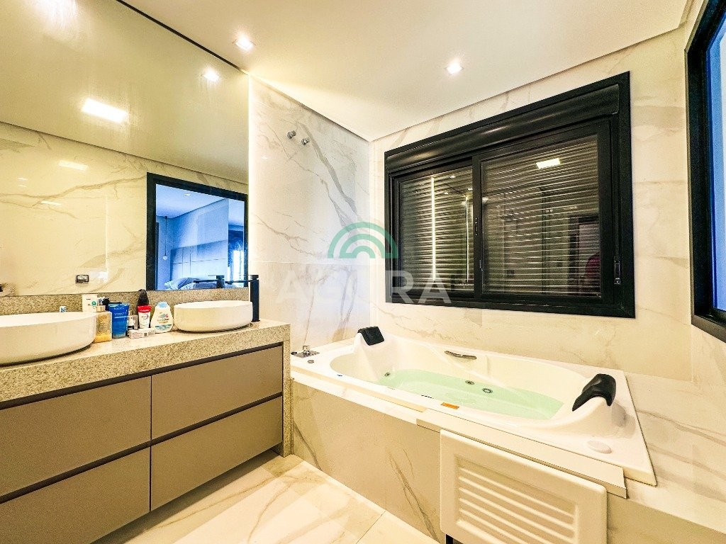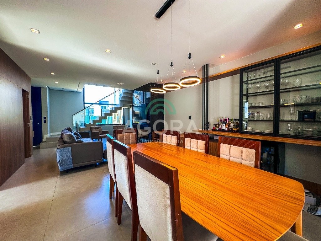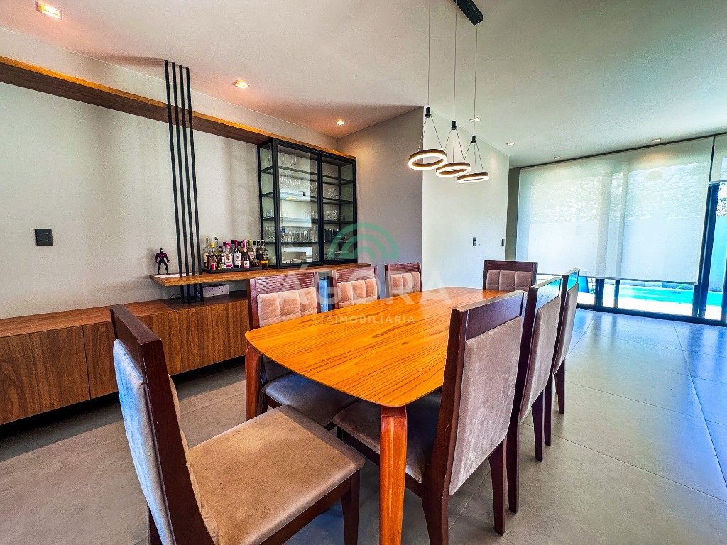 Sobrado mobiliado de alto padrão, 3 (três) dormitórios, sendo 1 (uma) suíte com sacada, closet e hidromassagem, 2 (dois) dormitórios com banheiro compartilhado, semimobiliado, com piscina aquecida, energia solar e área externa privativa. Ambientes integrados e acabamentos de qualidade, incluindo escada com guarda corpo em vidro e lareira a gás. No térreo, conta com ampla sala, cozinha planejada, churrasqueira, banheiro social, área de serviço e escritório. Diferenciais: sobrado inteligente, água aquecida em toda a residência, forro rebaixado, 3 (três) câmeras de segurança, e garagem para até 4 (quatro) veículos.