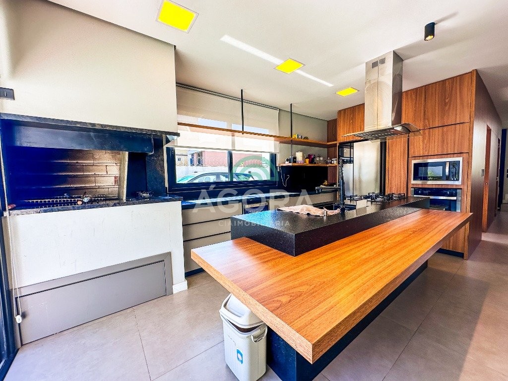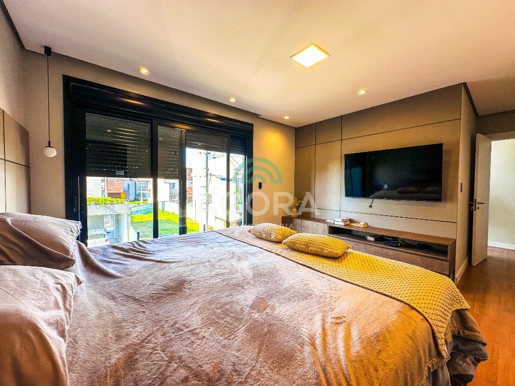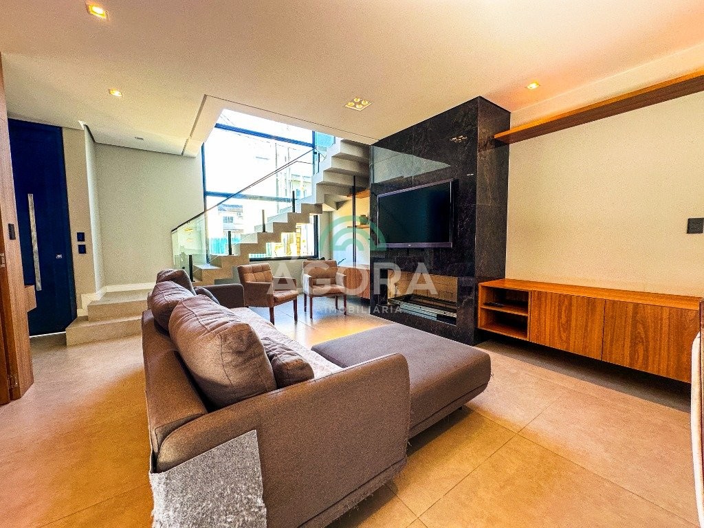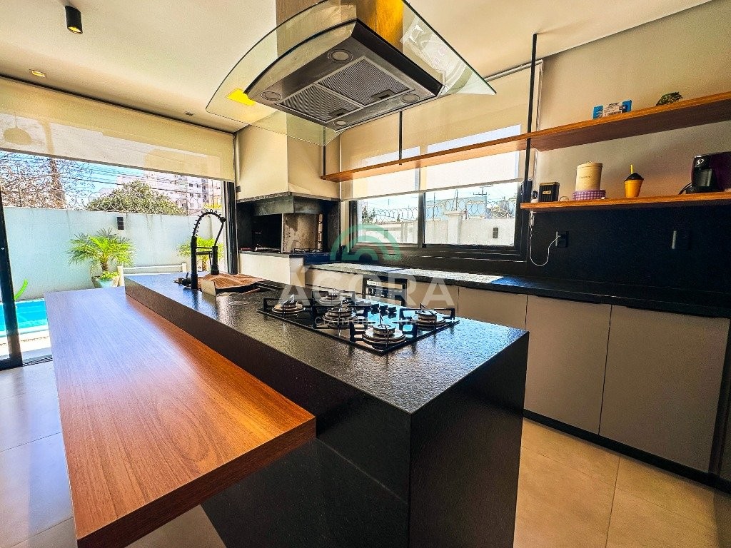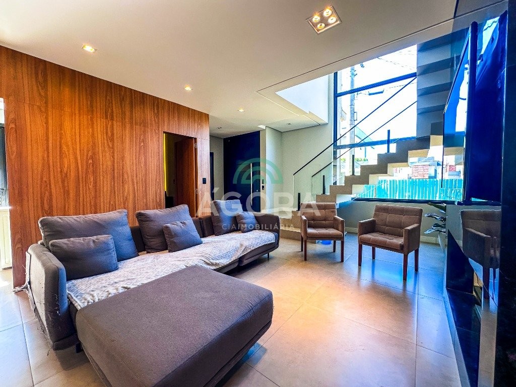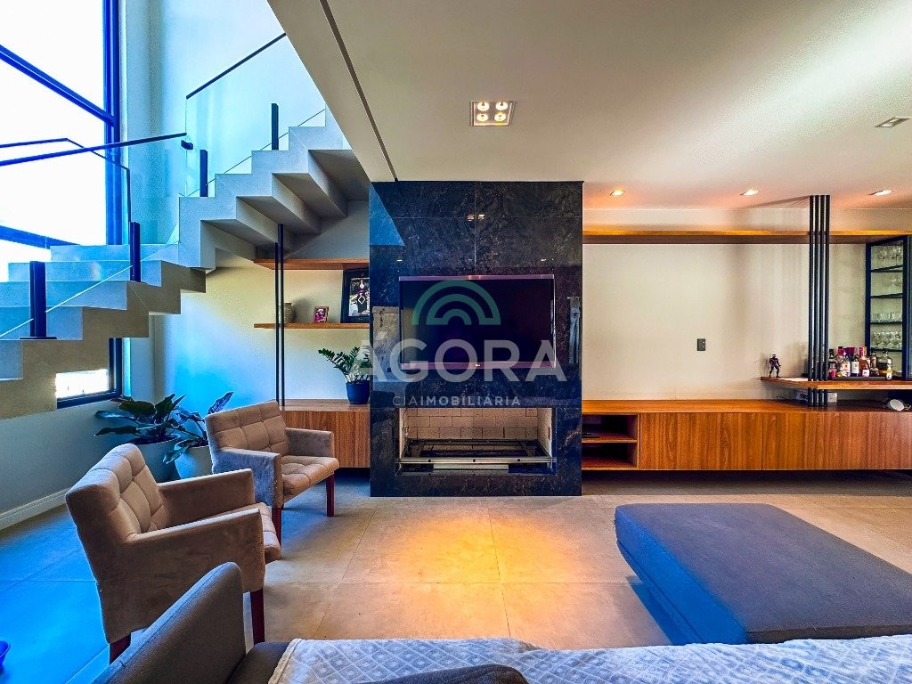 Sobrado mobiliado de alto padrão, 3 (três) dormitórios, sendo 1 (uma) suíte com sacada, closet e hidromassagem, 2 (dois) dormitórios com banheiro compartilhado, semimobiliado, com piscina aquecida, energia solar e área externa privativa. Ambientes integrados e acabamentos de qualidade, incluindo escada com guarda corpo em vidro e lareira a gás. No térreo, conta com ampla sala, cozinha planejada, churrasqueira, banheiro social, área de serviço e escritório. Diferenciais: sobrado inteligente, água aquecida em toda a residência, forro rebaixado, 3 (três) câmeras de segurança, e garagem para até 4 (quatro) veículos.