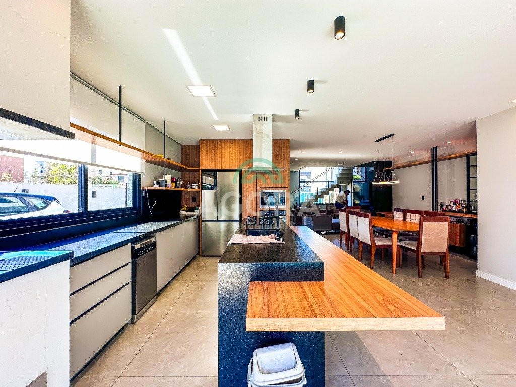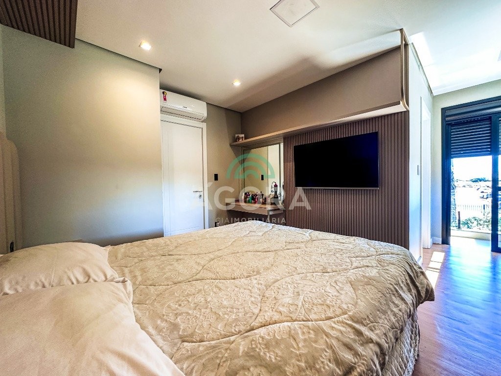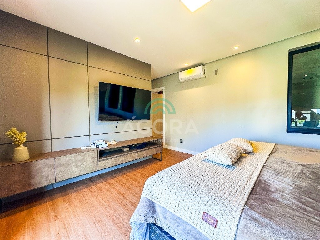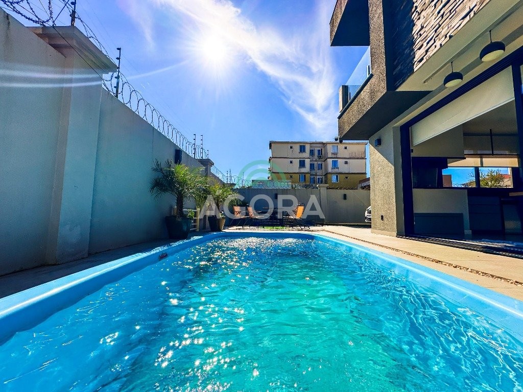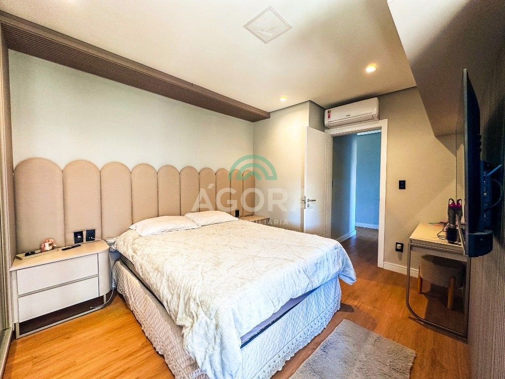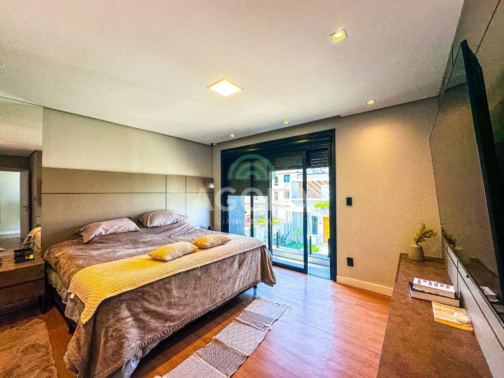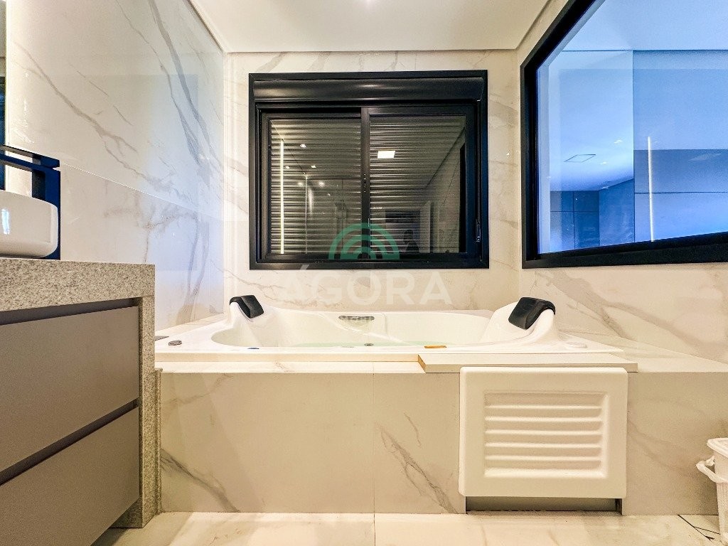 Sobrado mobiliado de alto padrão, 3 (três) dormitórios, sendo 1 (uma) suíte com sacada, closet e hidromassagem, 2 (dois) dormitórios com banheiro compartilhado, semimobiliado, com piscina aquecida, energia solar e área externa privativa. Ambientes integrados e acabamentos de qualidade, incluindo escada com guarda corpo em vidro e lareira a gás. No térreo, conta com ampla sala, cozinha planejada, churrasqueira, banheiro social, área de serviço e escritório. Diferenciais: sobrado inteligente, água aquecida em toda a residência, forro rebaixado, 3 (três) câmeras de segurança, e garagem para até 4 (quatro) veículos.