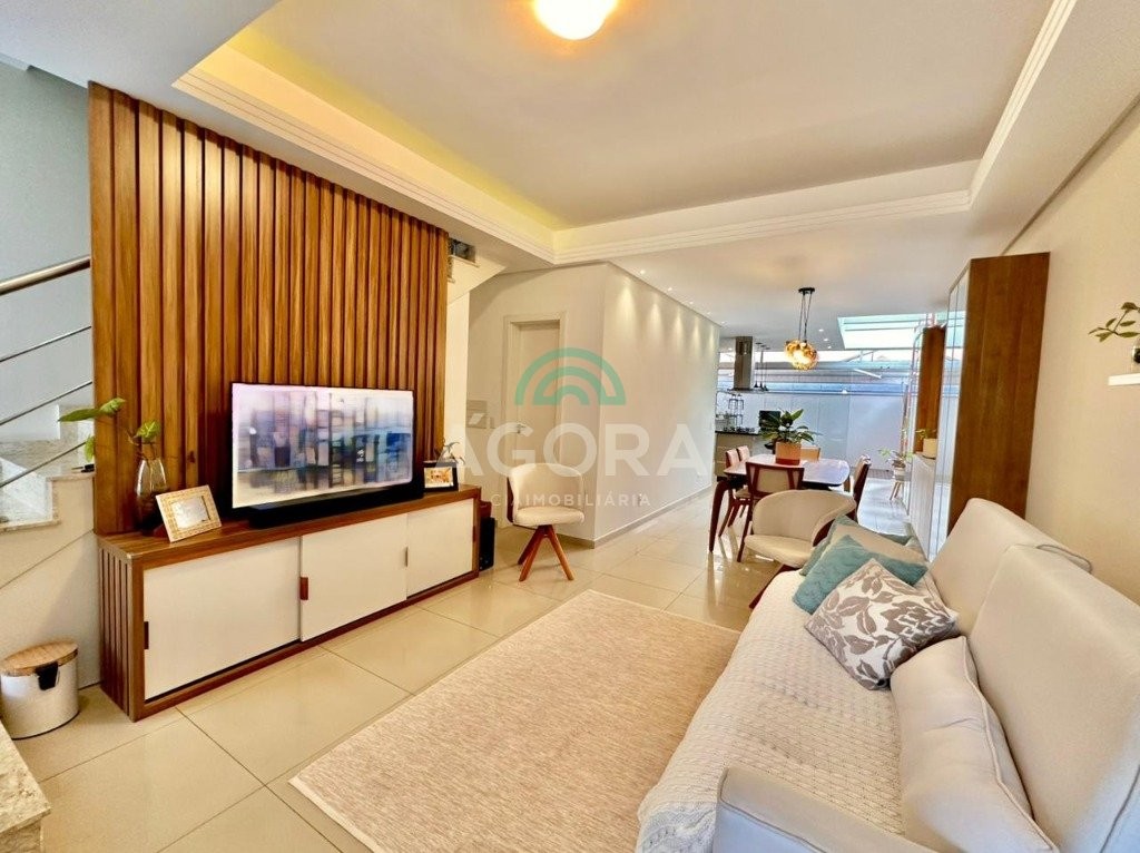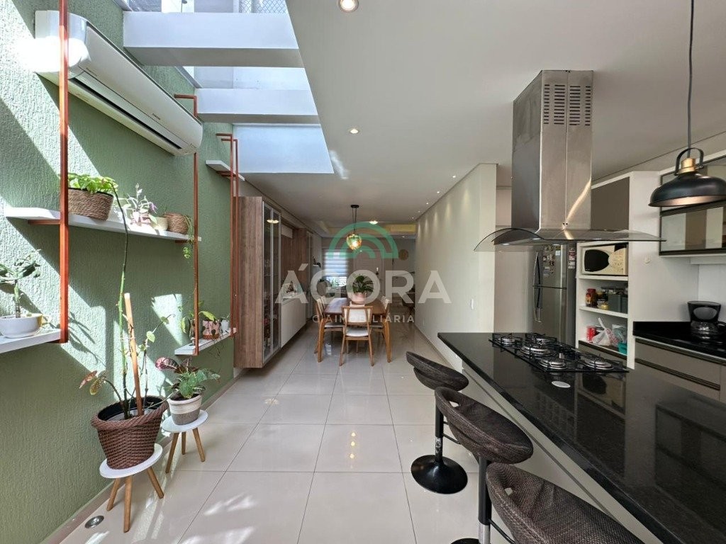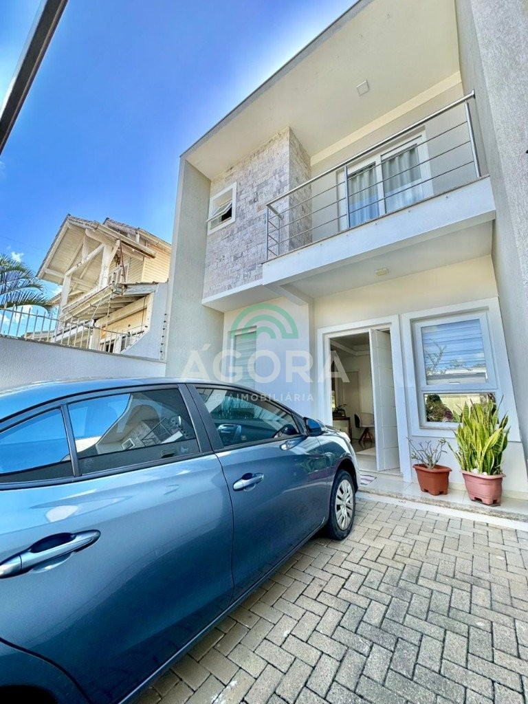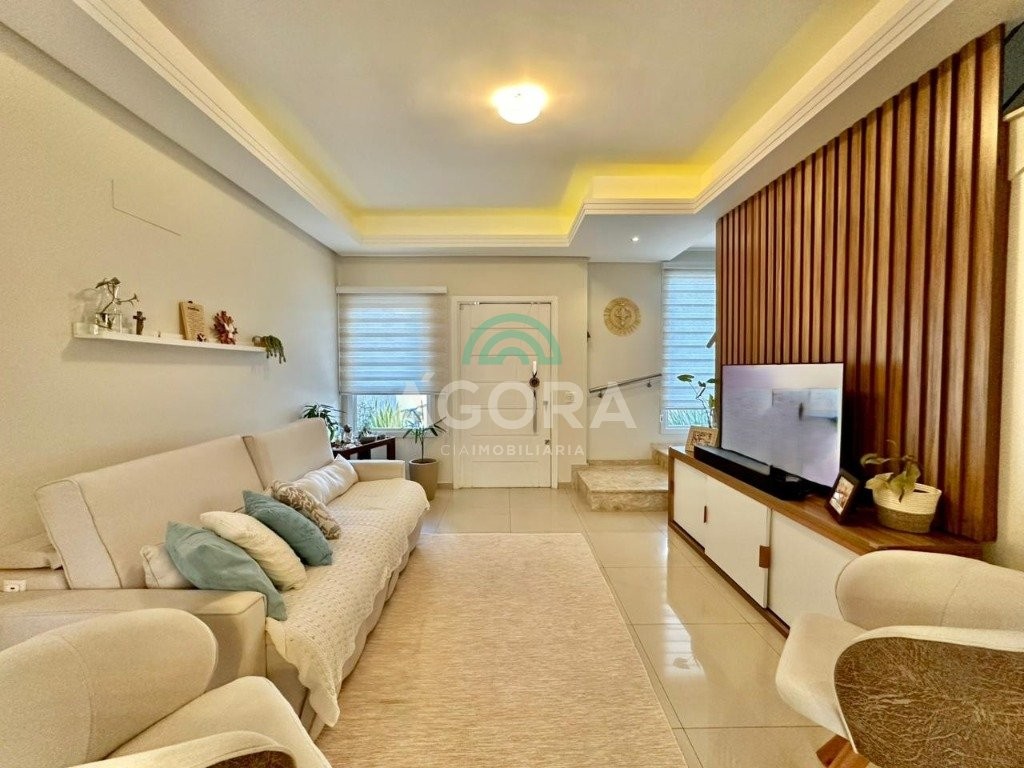 Ágora cia imobiliária vende: sobrado mobiliado com 120m² privativos, de 3 (três) dormitórios, sendo 1(um) suíte com sacada e closet, living integrado entre sala de estar, sala de jantar e cozinha com espaço gourmet completo com churrasqueira e ilha, pequeno pátio aos fundos de deck, banheiro social, lavabo, área de serviço, despensa e garagem para 2(dois) veículos lado a lado. Imóvel possui aquecedor de água a gás, com saídas de agua quente nas principais torneiras, permanece mobiliado, com cortinas, lustres, móveis soltos e 4 aparelhos de ar condicionado. Localizado no bairro igara, próximo ao park shopping canoas, e principais vias de acesso.
