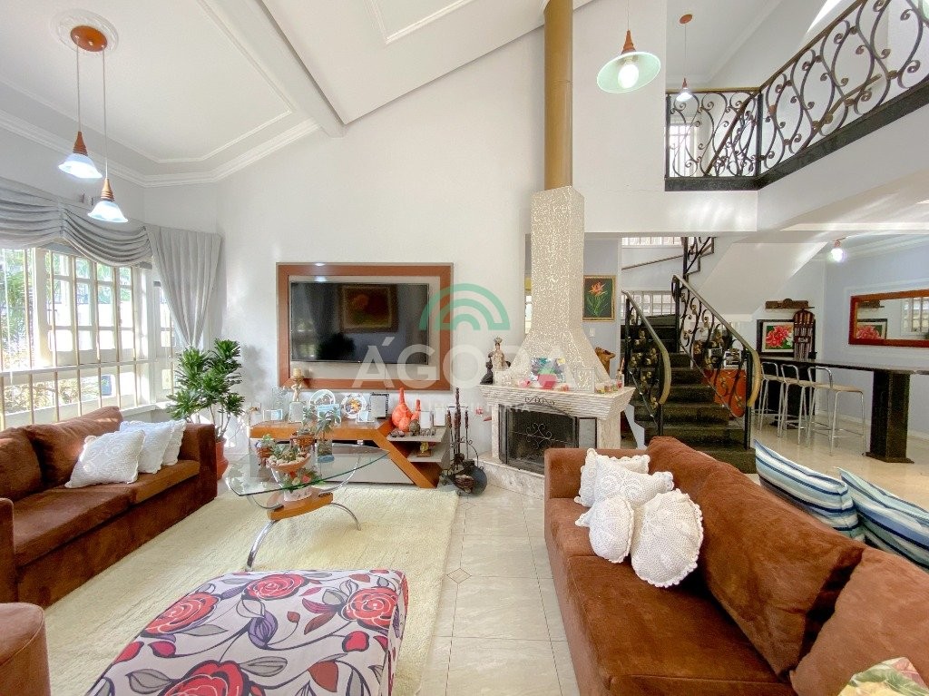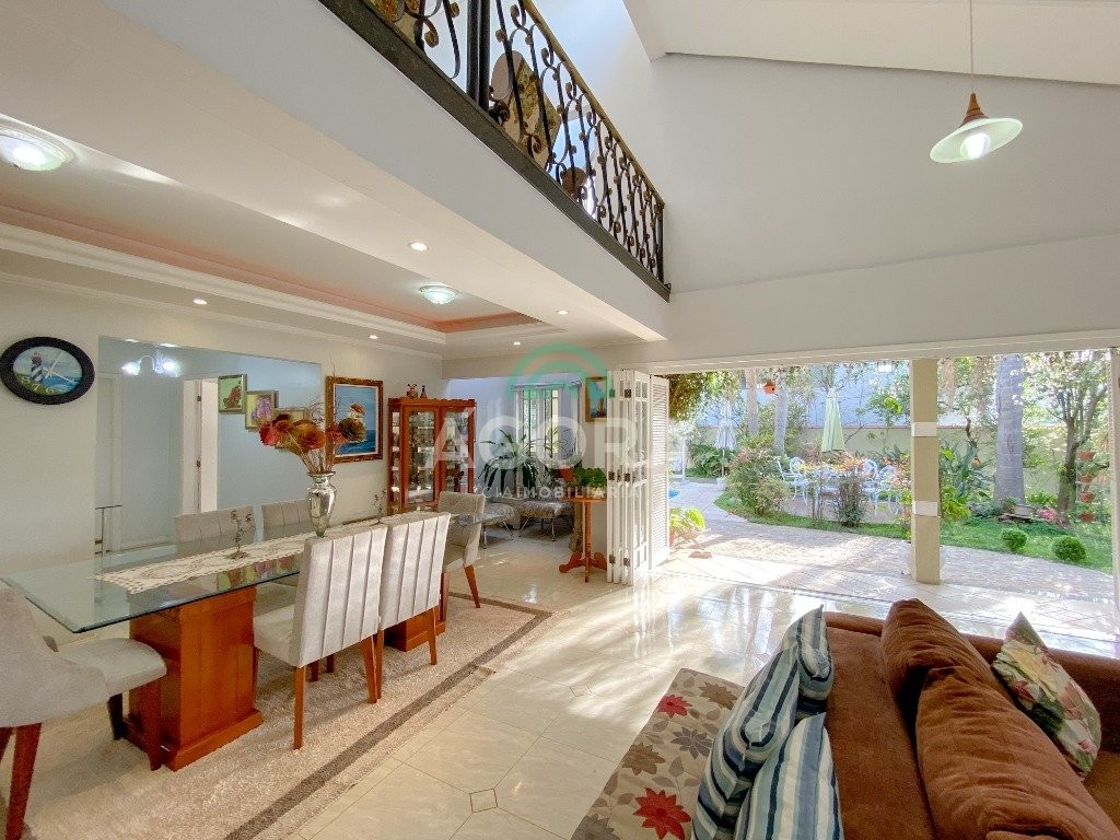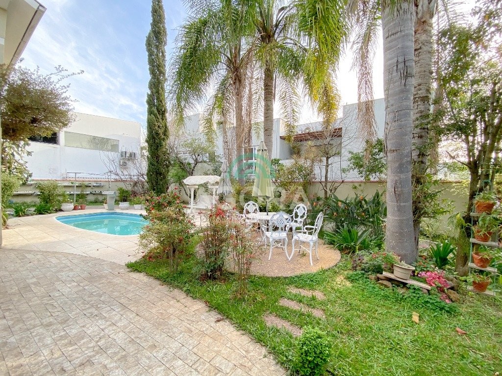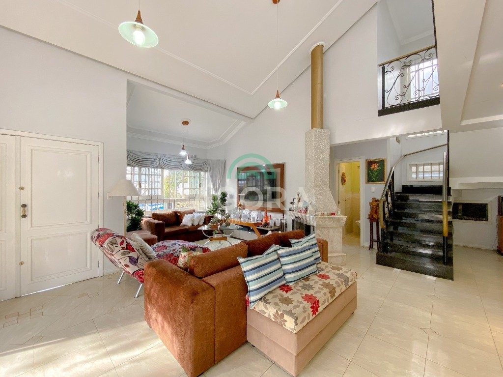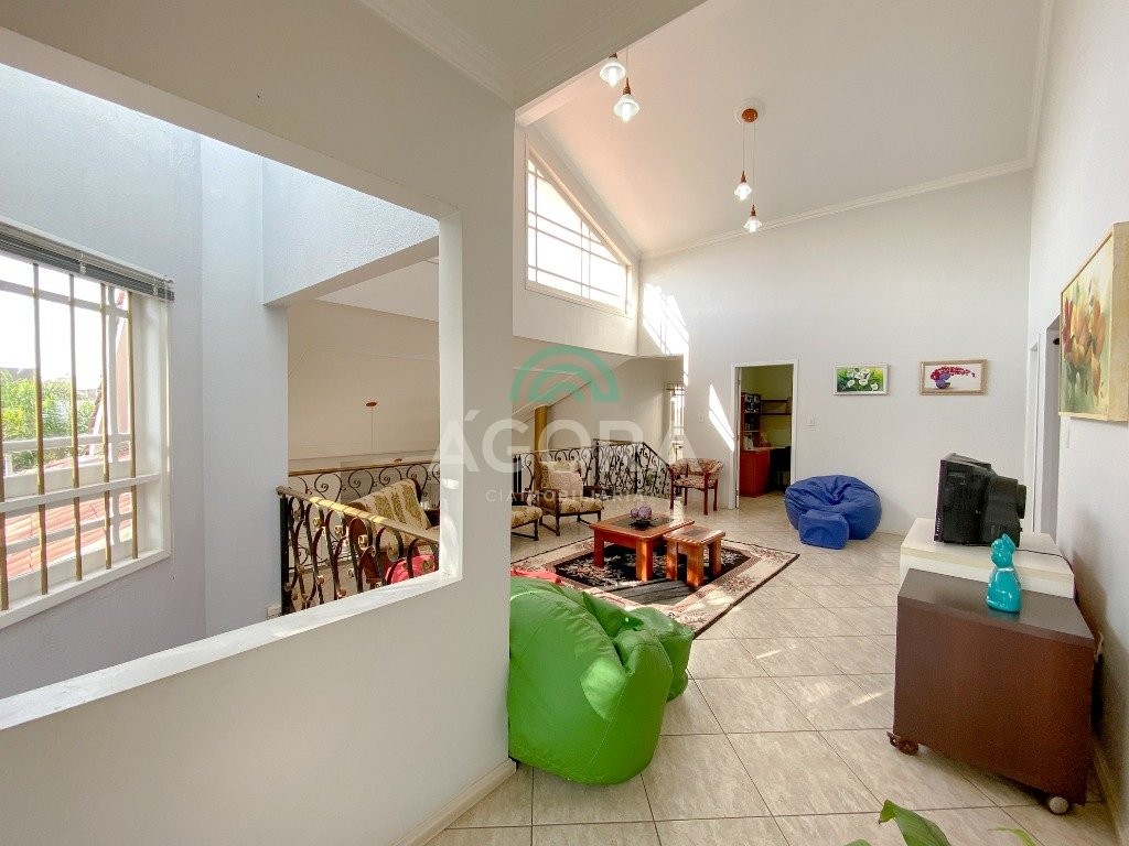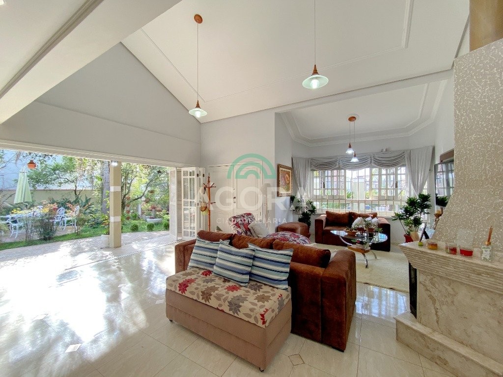 piso inferior com 2(duas) suítes sendo 1(uma) master, jardim de inverno, escritório, lavabo, salas de jantar com churrasqueira, sala de estar com lareira, sanca em gesso, piso porcelanato, depósito embaixo da escada, cozinha mobiliada e fogão à lenha, área de serviço, garagem coberta para 4(quatro) veículos mais 4(quatro) veículos descobertos, escada em granito, aberturas em madeira itaúba. Piso superior com mezanino e sacada, 1(uma) suíte com sacada, 2(dois) dormitórios, banho social, piso frio. Amplo pátio com piscina, jardim arborizado, poço artesiano 70 m de profundidade, cerca elétrica, portão eletrônico